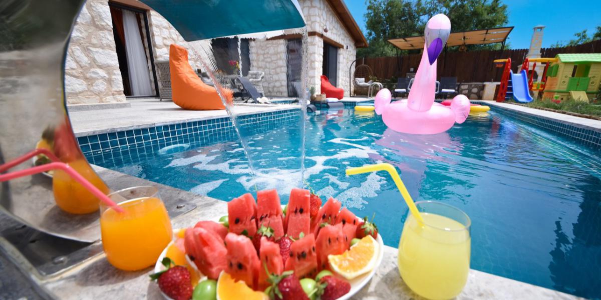Villamız, modern ve şık bir iç dekorasyona sahiptir. Geniş oturma alanları, konforlu yatak odaları ve tam donanımlı mutfak ile misafirlerine evlerindeki rahatlığı sunmayı amaçlamaktadır. Ayrıca, villanın her odasından doğa manzarasının tadını çıkarabilirsiniz. Villamızın bahçesi, doğayla iç içe bir tatil deneyimi yaşamak isteyen misafirler için özenle düzenlenmiştir. Bahçede yer alan korunaklı havuz, tamamen gözlerden uzak bir şekilde yüzme keyfi yaşamanızı sağlar. Havuz kenarındaki şezlonglarda güneşin tadını çıkarabilir, gölgelik alanlarda ise serinleyebilirsiniz.