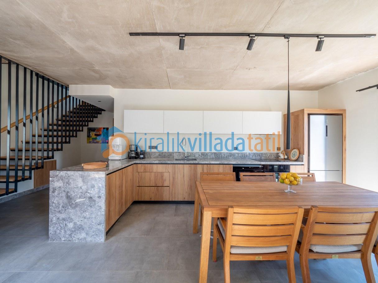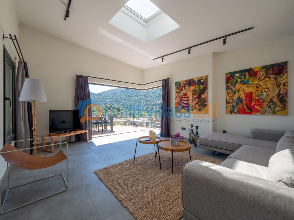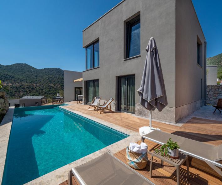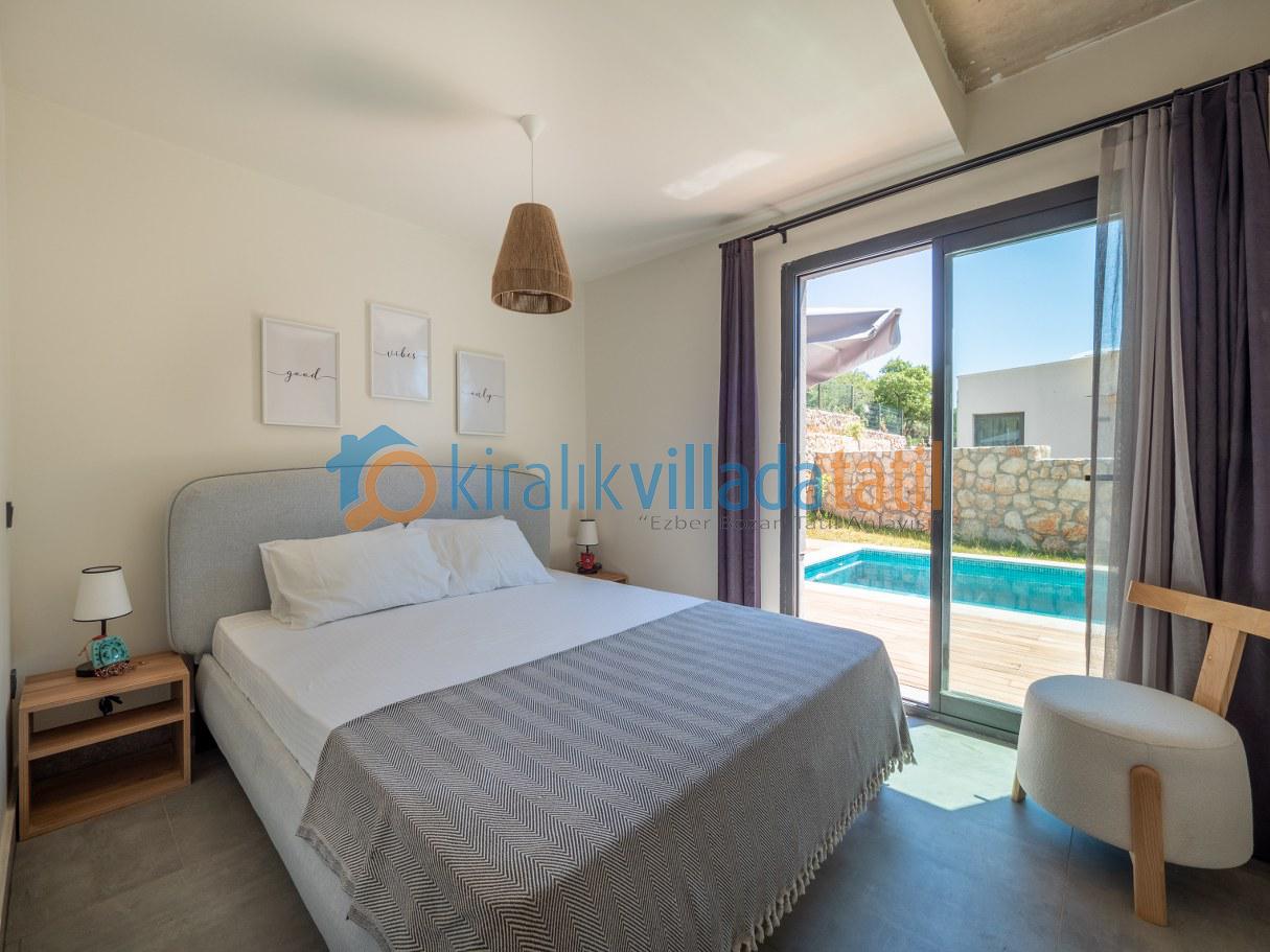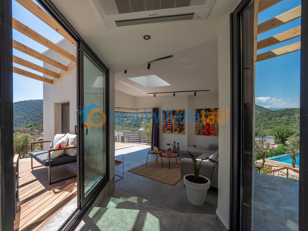 Doğal ışığı maksimum seviyede içeri alan geniş cam yüzeyler, zarif detaylarla dekore edilmiş salon ve tam donanımlı mutfak alanı ile birleşerek hem estetik hem de rahat bir yaşam alanı oluşturur. İç mekânda tercih edilen modern ve sade tasarım çizgisi, tatil boyunca ihtiyaç duyabileceğiniz tüm konforu bir arada sunacak şekilde planlanmıştır. Villanın tamamen size ait olan dış yaşam alanında özel yüzme havuzu, güneşlenme terası, oturma grubu ve yemek alanı yer almaktadır. Doğanın eşsiz dokusu eşliğinde sabah kahvaltılarınızı keyifle yapabilir, gün içerisinde havuzun tadını çıkarabilir, akşam saatlerinde ise sevdiklerinizle birlikte huzurlu ve unutulmaz anlar yaşayabilirsiniz.