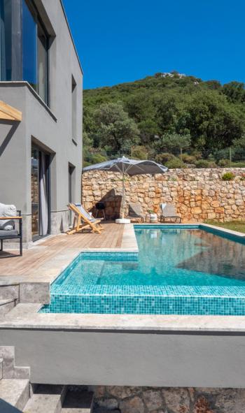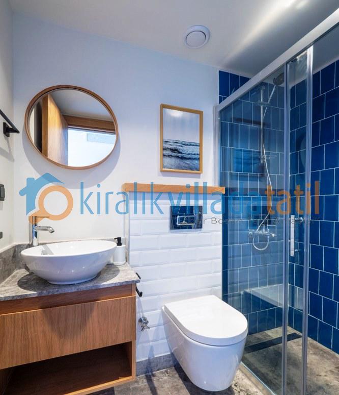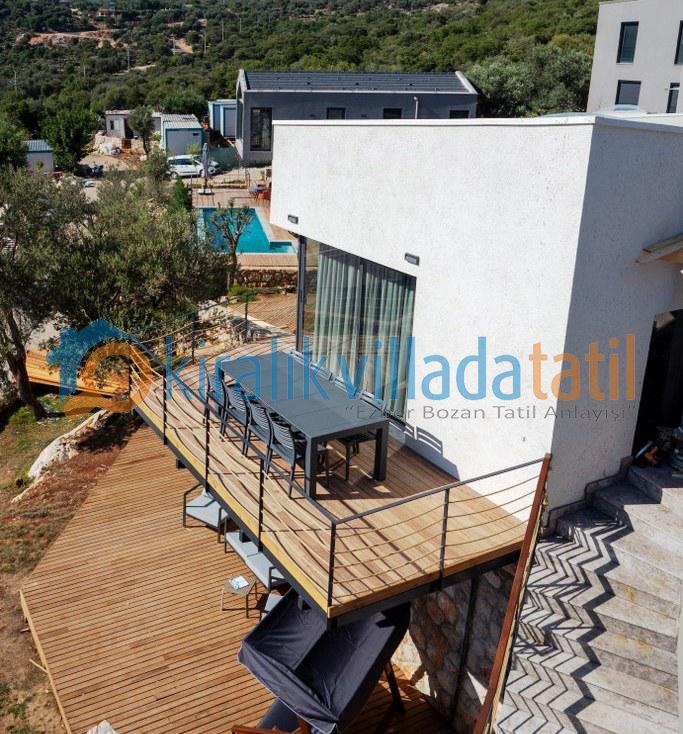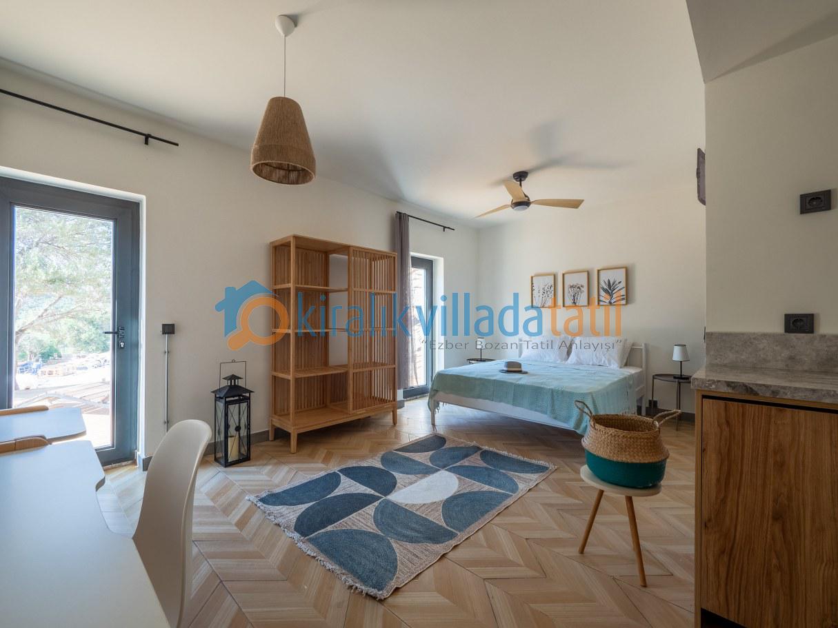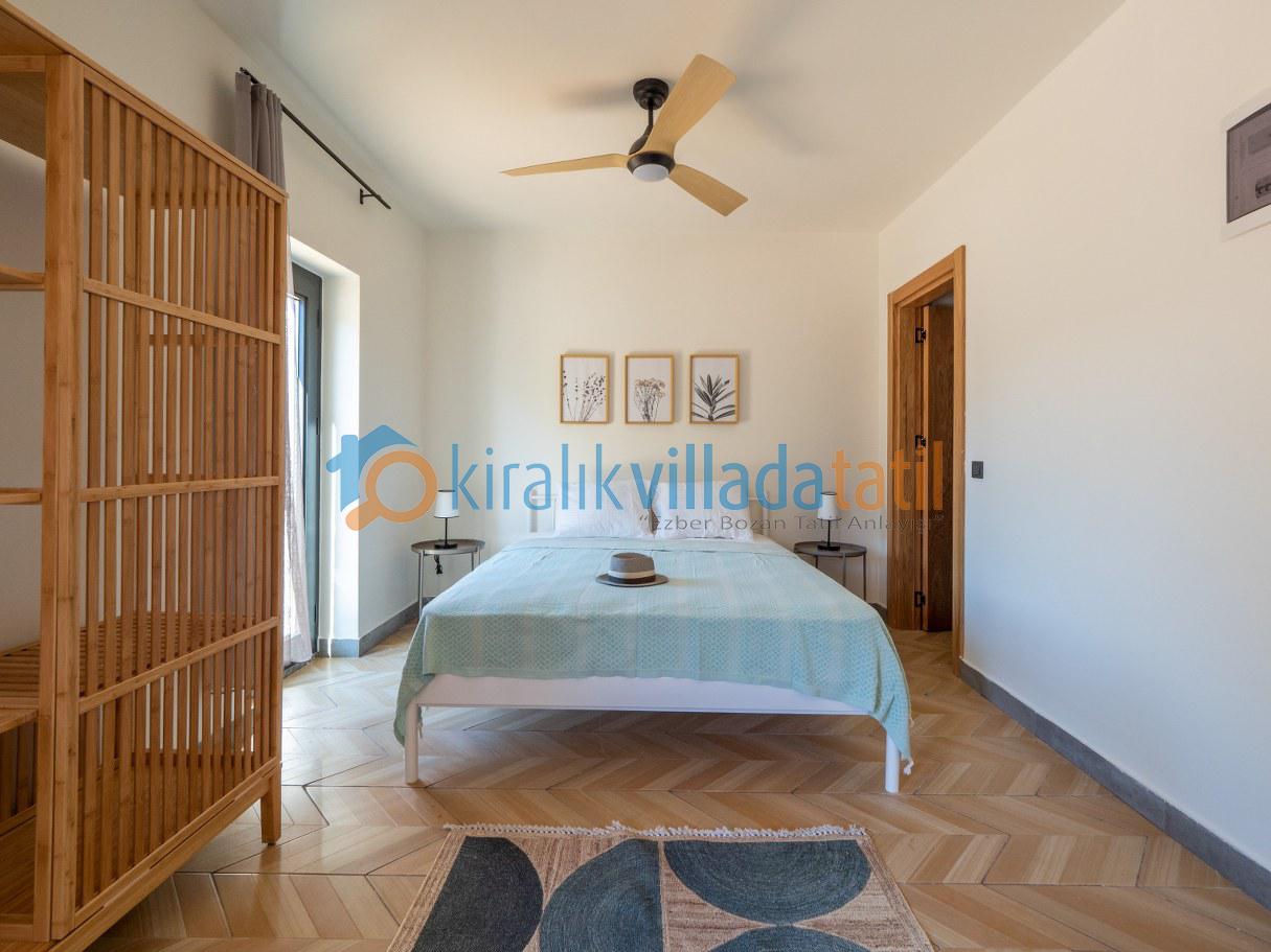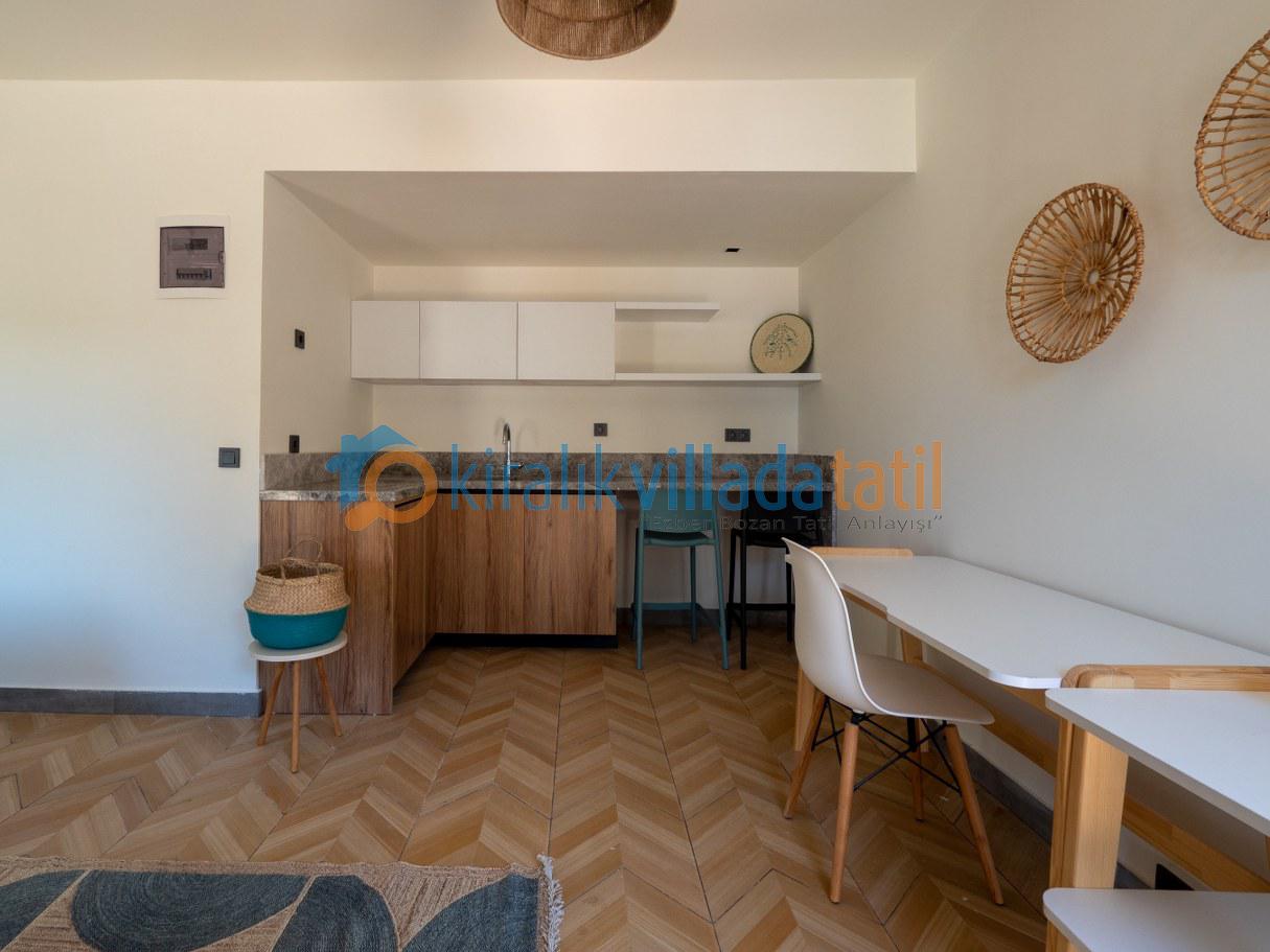 Doğal ışığı maksimum seviyede içeri alan geniş cam yüzeyler, zarif detaylarla dekore edilmiş salon ve tam donanımlı mutfak alanı ile birleşerek hem estetik hem de rahat bir yaşam alanı oluşturur. İç mekânda tercih edilen modern ve sade tasarım çizgisi, tatil boyunca ihtiyaç duyabileceğiniz tüm konforu bir arada sunacak şekilde planlanmıştır. Villanın tamamen size ait olan dış yaşam alanında özel yüzme havuzu, güneşlenme terası, oturma grubu ve yemek alanı yer almaktadır. Doğanın eşsiz dokusu eşliğinde sabah kahvaltılarınızı keyifle yapabilir, gün içerisinde havuzun tadını çıkarabilir, akşam saatlerinde ise sevdiklerinizle birlikte huzurlu ve unutulmaz anlar yaşayabilirsiniz.