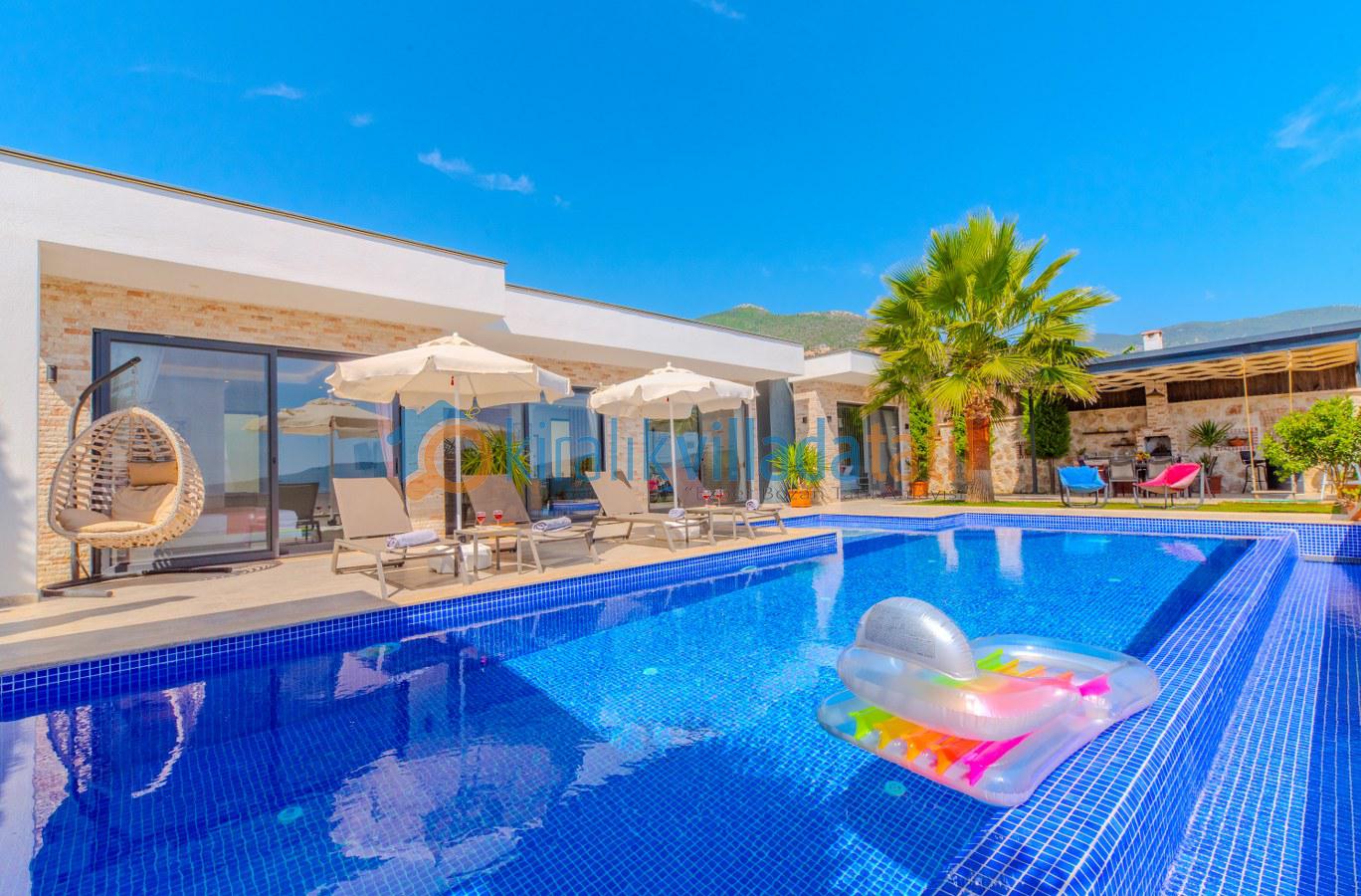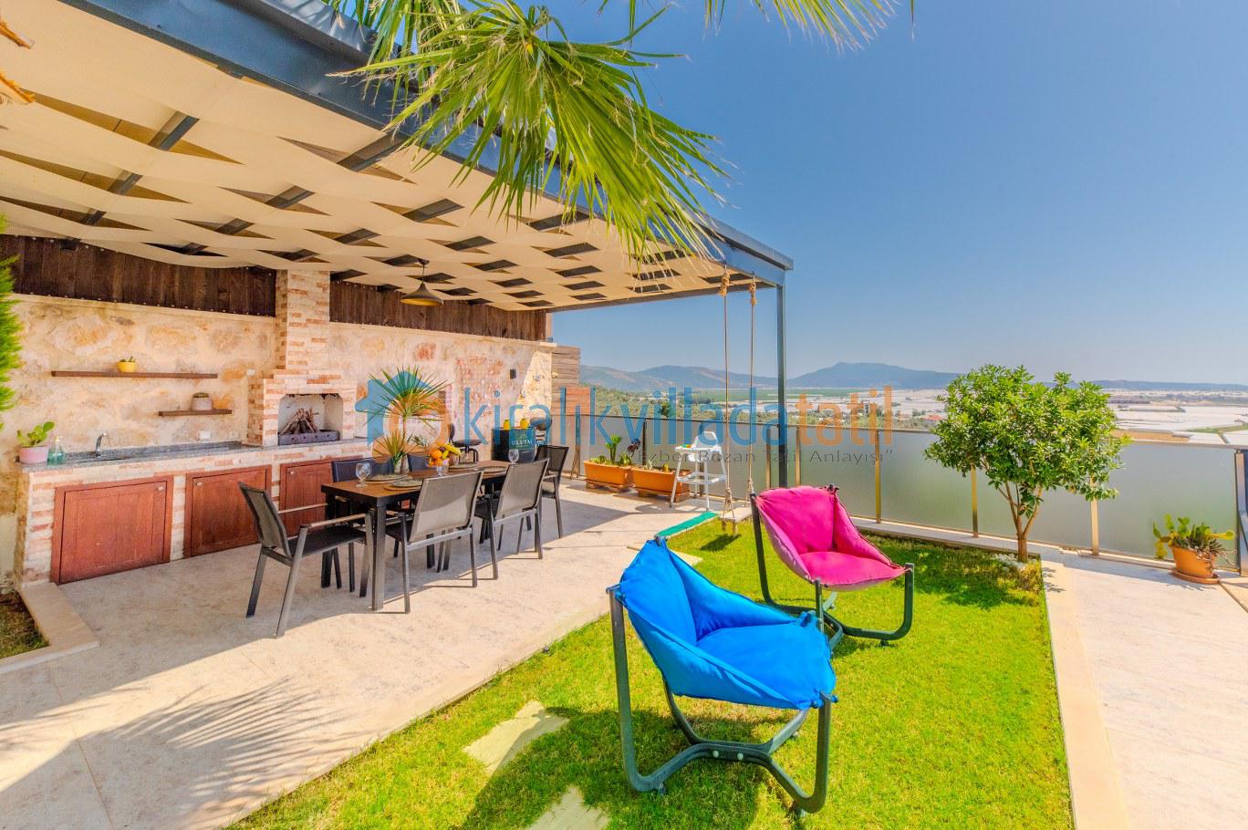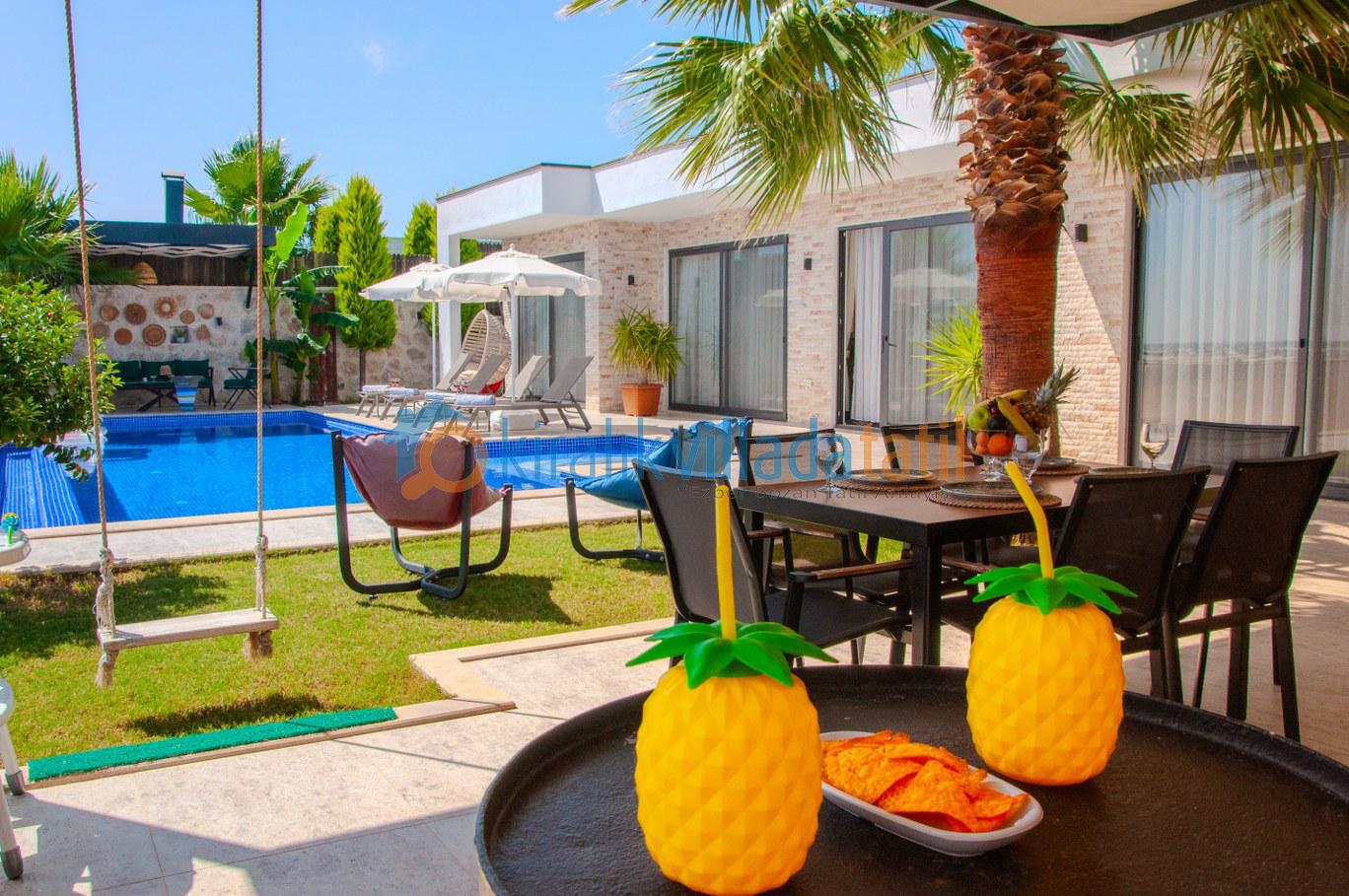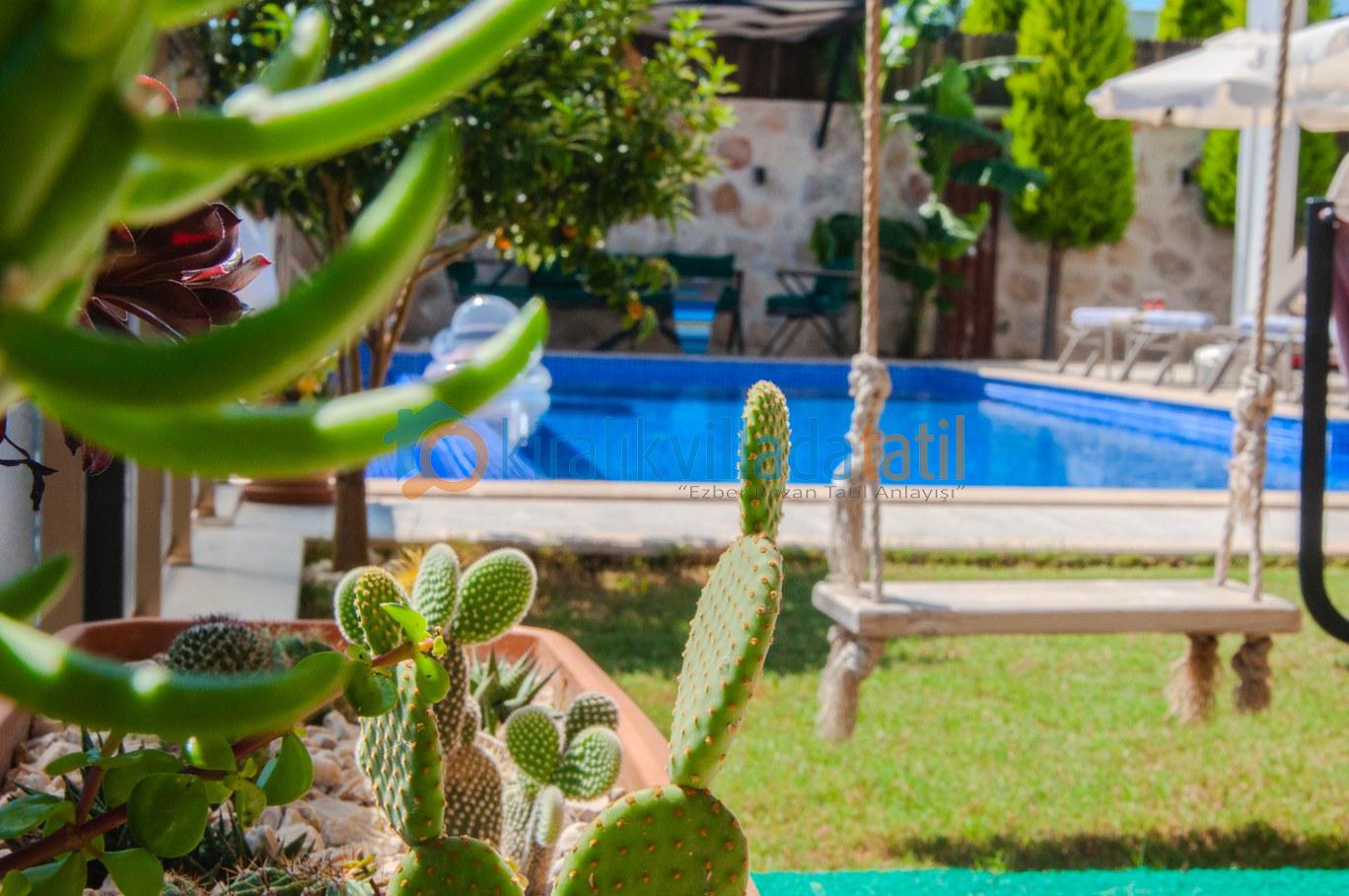 Villanın dış alanında yer alan 12x4 metre ölçülerindeki büyük ve korunaklı özel havuz, geniş havuz terasıyla birlikte gün boyu rahatça vakit geçirmenize imkân tanıyor. Havuz terasında oturma grubu, salıncak, puf koltuklar ve yemek masası bulunurken; mangal alanı sayesinde akşam yemeklerinizi açık havada, doğa manzarası eşliğinde hazırlayabilirsiniz. Yeşil dokuyla çevrili bahçe alanı, kalabalıktan uzak huzurlu bir atmosfer sunuyor.