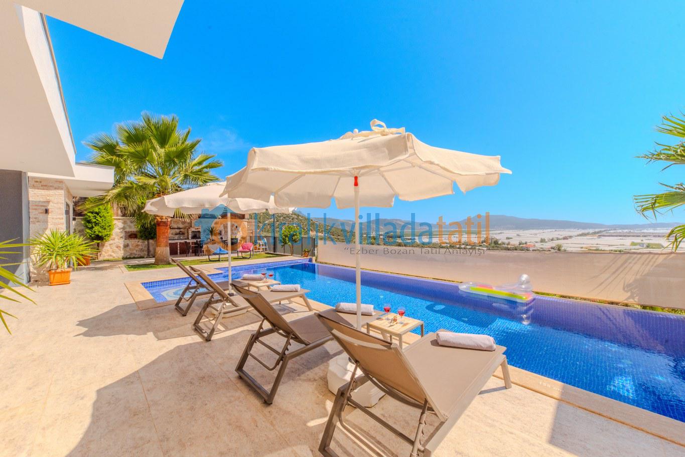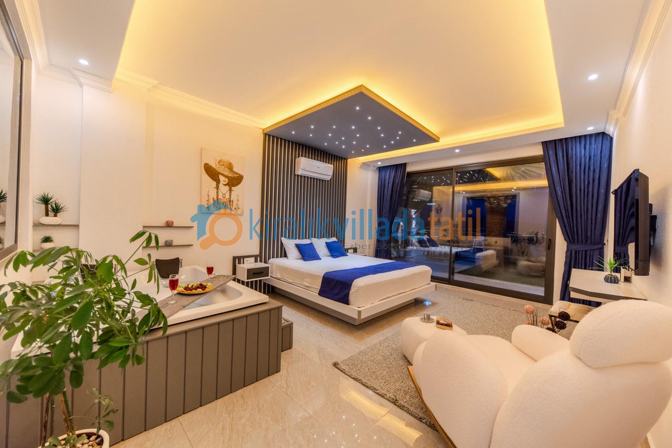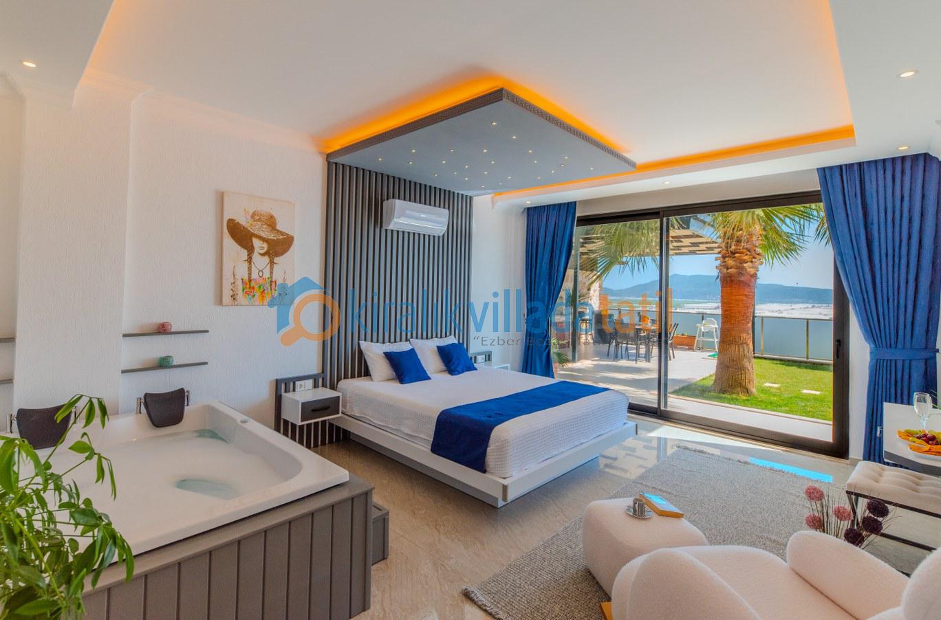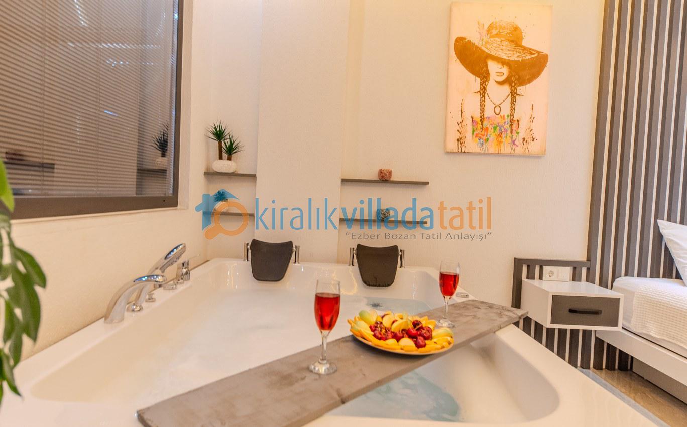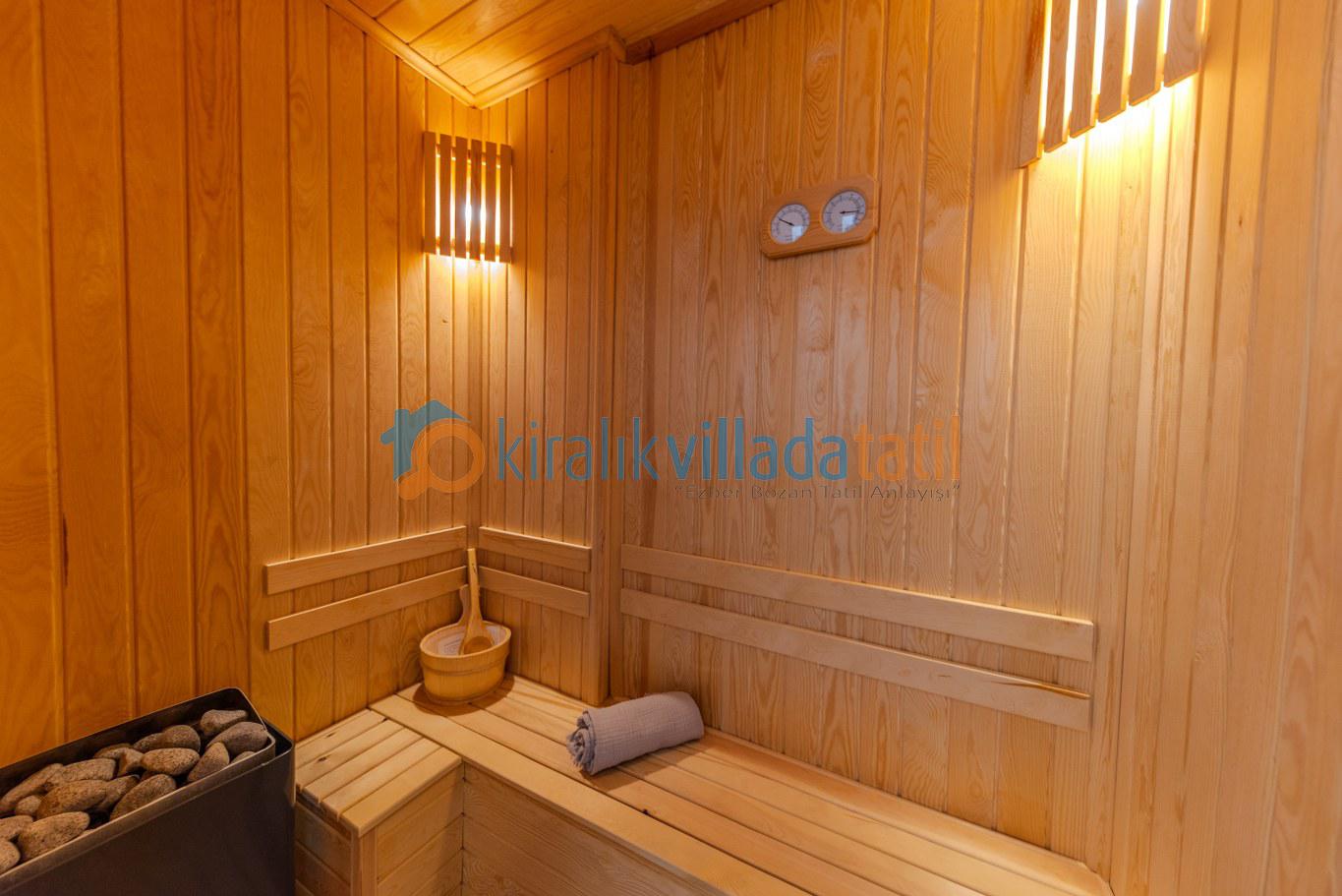 Yatak odasında yer alan jakuzi ve sauna ise tatilinize ayrı bir ayrıcalık katıyor. Günün yorgunluğunujakuzide atabilir, saunada rahatlayarak kendinize özel bir spa keyfi yaşayabilirsiniz. Korunaklı havuz yapısı sayesinde dışarıdan görünmeyen bu alan, muhafazakâr misafirler için de konforlu bir kullanım sağlıyor.