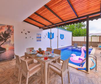 Doğa manzarasına sahip olan villamız, misafirlerine yemyeşil bir ortamda unutulmaz bir tatil sunmaktadır. Özel yüzme havuzu tamamen korunaklı bir yapıya sahiptir ve bu özelliği sayesinde mahremiyetine önem veren muhafazakâr aileler için ideal bir seçenek sunar.