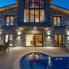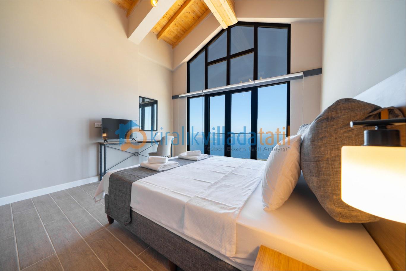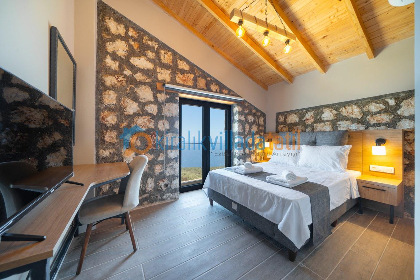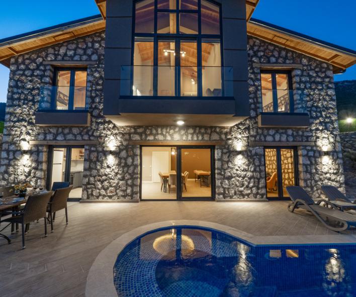 Üç yatak odasıyla toplamda altı kişiye kadar konaklama kapasitesi sunan villa; geniş iç hacmi, doğayla uyumlu mimari kurgusu ve manzaraya açılan dış yaşam alanlarıyla üst düzey konfor hedeflenerek tasarlanmıştır. Dışarıdan görünmeyen özel havuz alanı sayesinde mahremiyet ön planda tutulurken, gün batımında Akdeniz siluetine karşı keyifli vakit geçirebileceğiniz özel alanlar tatilinize değer katar. Doğal taş yüzeyler, ahşap detaylar ve modern dekorasyon öğeleri villanın karakteristik lüks segment kimliğini destekler.