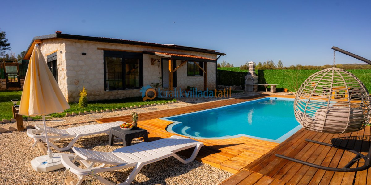 Villanın korunaklı yapısı, misafirlerin gizliliği ve mahremiyeti için özenle tasarlanmıştır. Geniş havuz alanı ve çevresi, tatilcilerin rahatlıkla güneşlenip dinlenebileceği bir ortam sunar.