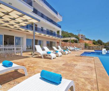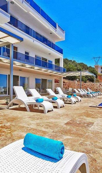 Adeta bir butik otel büyüklüğünde dizayn edilmiş villamız kalabalık aile ve arkadaş grupları, ya da düğün ya da iş toplantısı sebebiyle bir araya gelmiş kişilerin konaklaması için en uygun villalarımızdan biridir. Bütün yatak odaları süit banyolu ve muhteşem Kalkan manzarasına sahiptir. 1.Kalite malzemeler kullanılarak iç ve dış dizayn edilen villamızda internet bağlantısı, güvenlik kamerası sistemi, saç kurutma makinesi, barbekü,ihtiyacınız olan mobilya mutfak araç gereçleri masa tenisi ve kasa mevcuttur. Havuzun ortasındaki bölüm manzaraya karşı jakuzi keyfi yapabileceğiniz bir bölümdür.