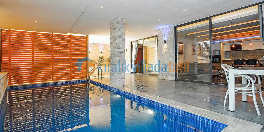 Modern çizgilerle dekore edilen iç mekânlar, konforu merkeze alan detaylarla tamamlanmıştır. villada yalnızca iç alanda bulunan geniş kapalı havuz dört mevsim keyifli bir kullanım sunacak şekilde planlanmıştır. kapalı havuzda yer alan ısıtma sistemi sayesinde kış dönemlerinde de havuz keyfi yaşanabilmektedir. ısıtma hizmeti günlük 2000 TL karşılığında sunulmakta olup bu hizmetten faydalanmak isteyen misafirlerin giriş tarihinden en az iki gün önce bilgi vermeleri gerekmektedir.