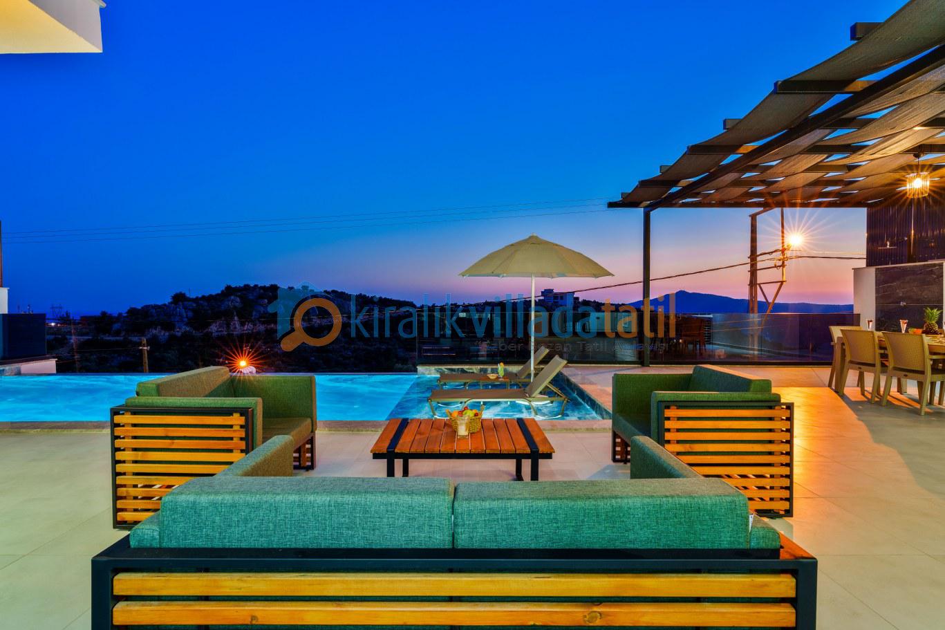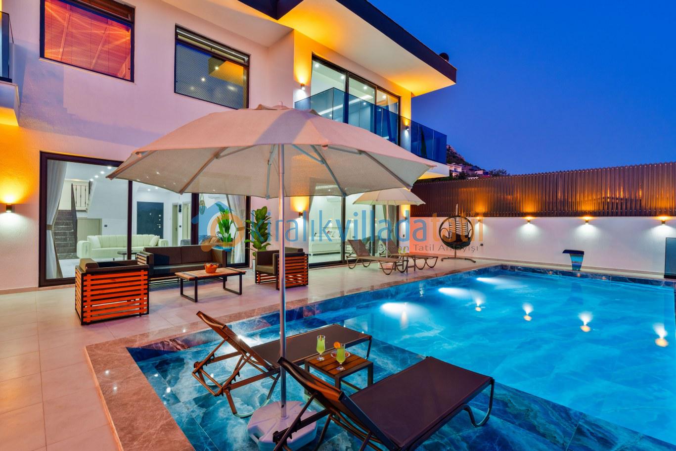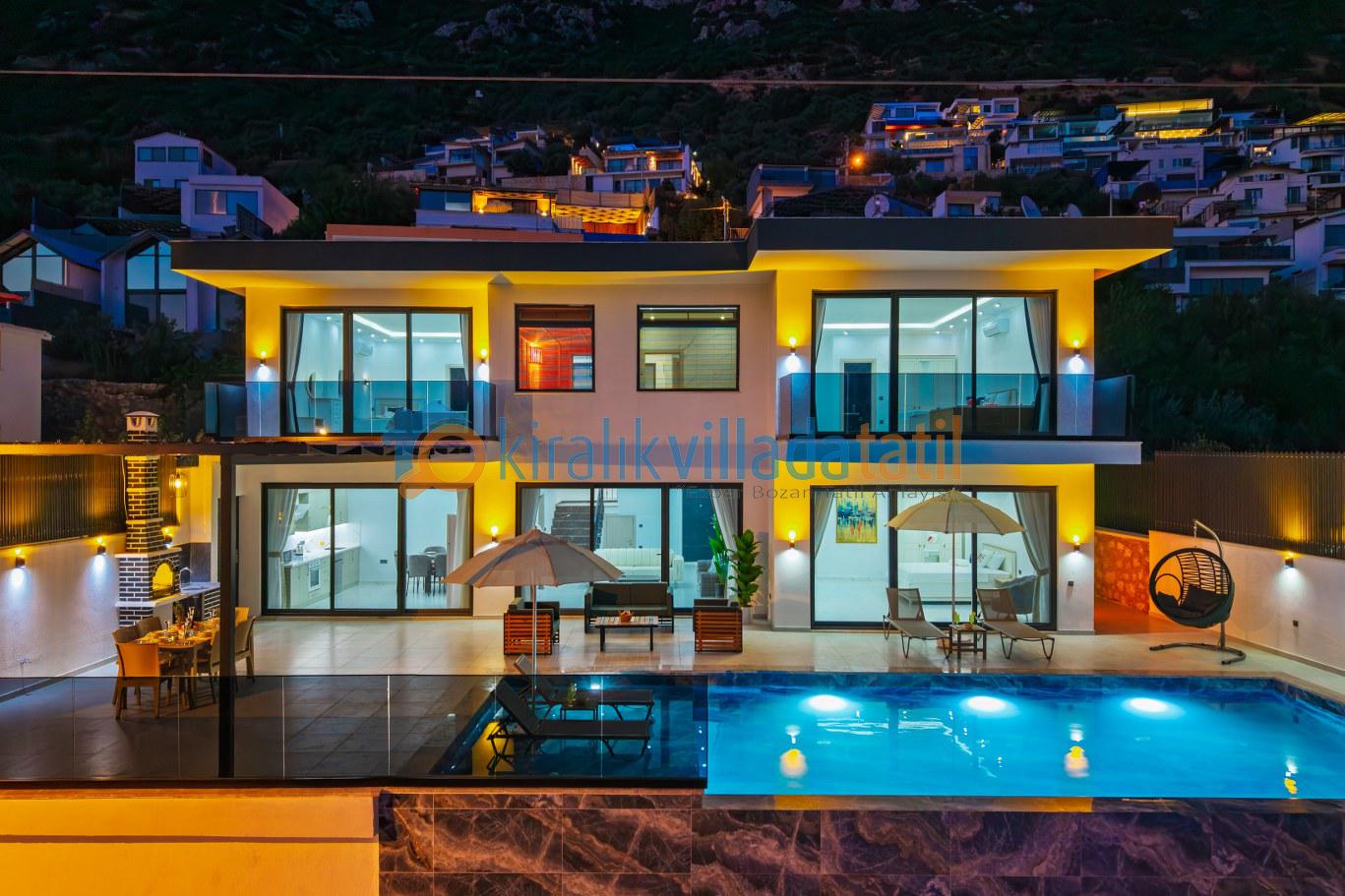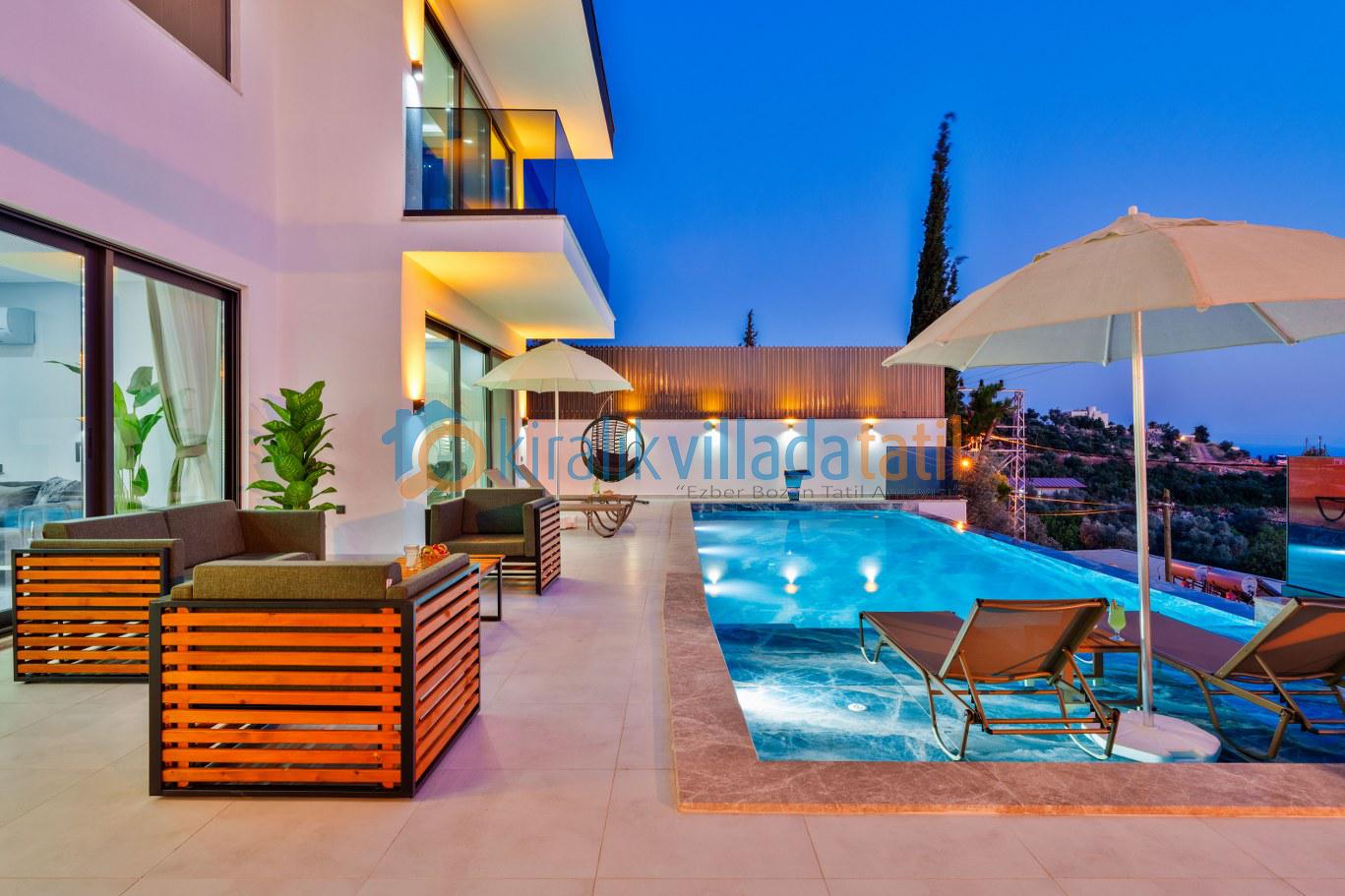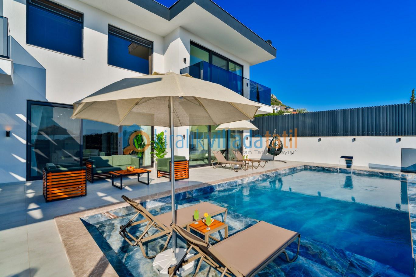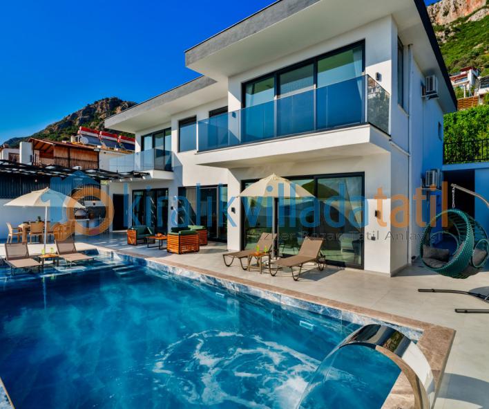 Villanın dış yaşam alanı korunaklı yüzme havuzu,sahiptir.Havuz terasında bulunan şezlonglar, oturma grubu ve geniş güneşlenme alanı gün boyu Akdeniz güneşinin keyfini çıkarabileceğiniz bir ortam oluşturur. Havuz başında yer alan mangal alanı ve geniş yemek masası, sevdiklerinizle birlikte keyifli akşam yemekleri ve uzun sohbetler için ideal bir atmosfer sağlar. Villanın iç mekânı modern ve konforlu bir anlayışla tasarlanmıştır. Geniş ve ferah salon bölümü, modern mutfak ile birleşerek misafirlere ev konforunda bir yaşam alanı sunar. Büyük cam yüzeyler sayesinde gün boyu doğal ışık alan yaşam alanlarında, Kalkan’ın eşsiz deniz manzarası adeta iç mekânın bir parçası haline gelir.