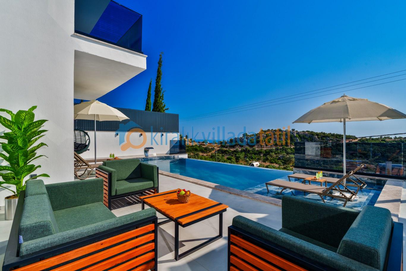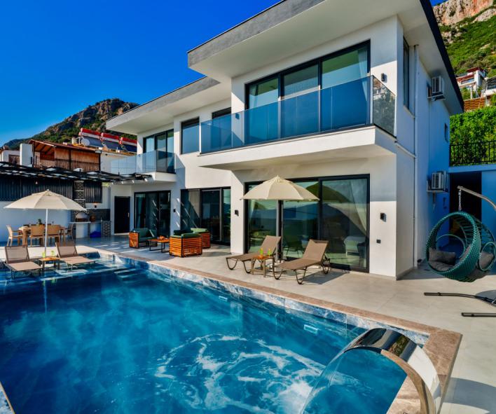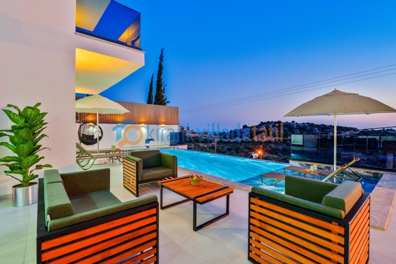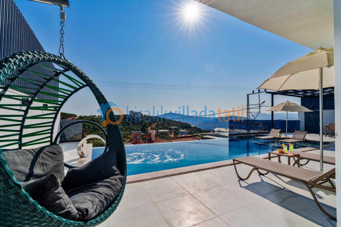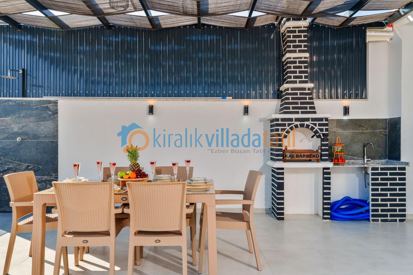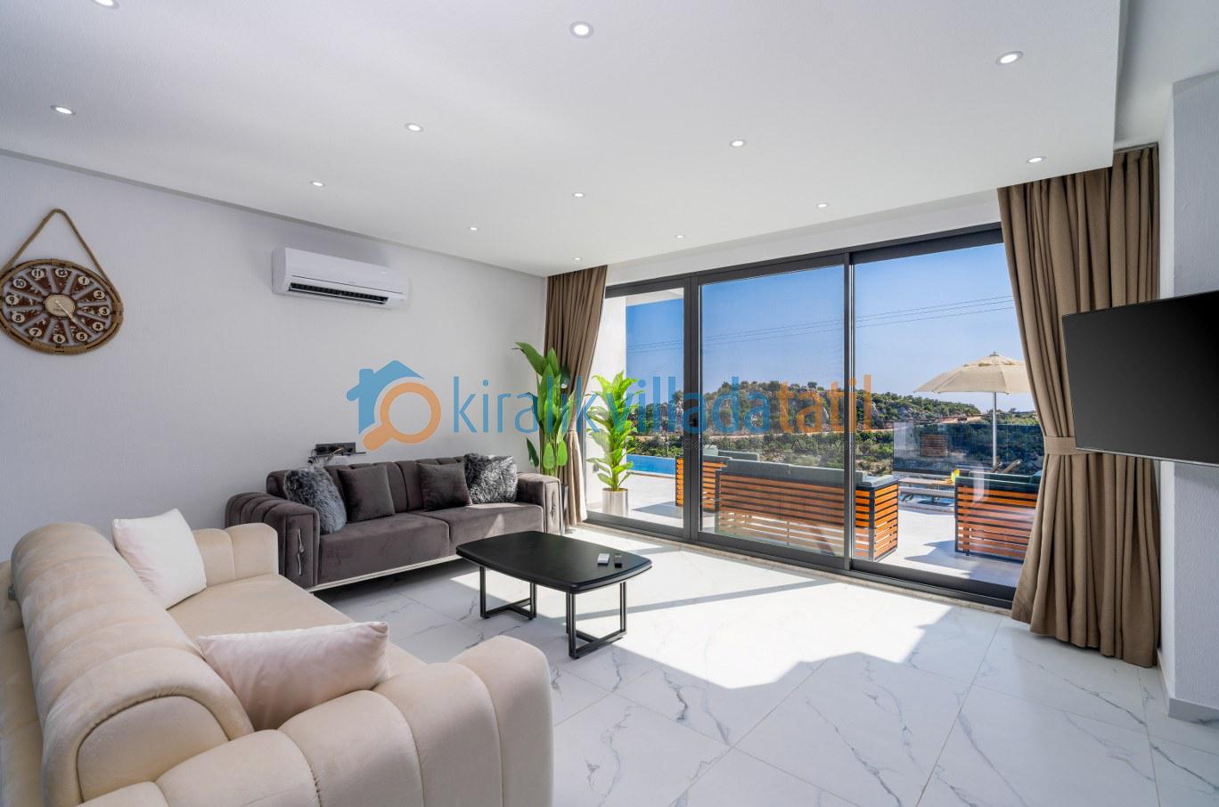 Villanın dış yaşam alanı korunaklı yüzme havuzu,sahiptir.Havuz terasında bulunan şezlonglar, oturma grubu ve geniş güneşlenme alanı gün boyu Akdeniz güneşinin keyfini çıkarabileceğiniz bir ortam oluşturur. Havuz başında yer alan mangal alanı ve geniş yemek masası, sevdiklerinizle birlikte keyifli akşam yemekleri ve uzun sohbetler için ideal bir atmosfer sağlar. Villanın iç mekânı modern ve konforlu bir anlayışla tasarlanmıştır. Geniş ve ferah salon bölümü, modern mutfak ile birleşerek misafirlere ev konforunda bir yaşam alanı sunar. Büyük cam yüzeyler sayesinde gün boyu doğal ışık alan yaşam alanlarında, Kalkan’ın eşsiz deniz manzarası adeta iç mekânın bir parçası haline gelir.