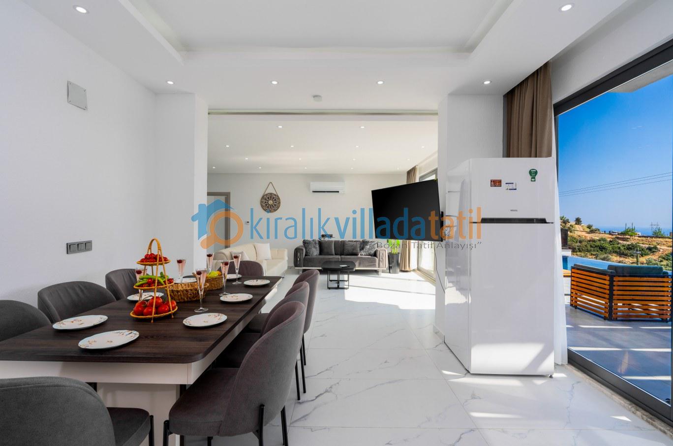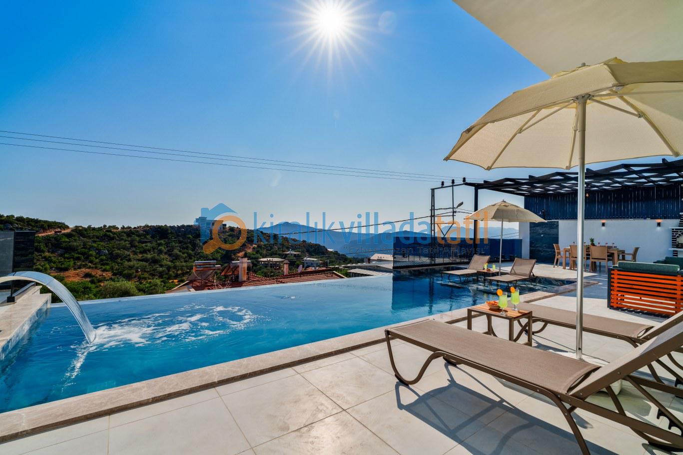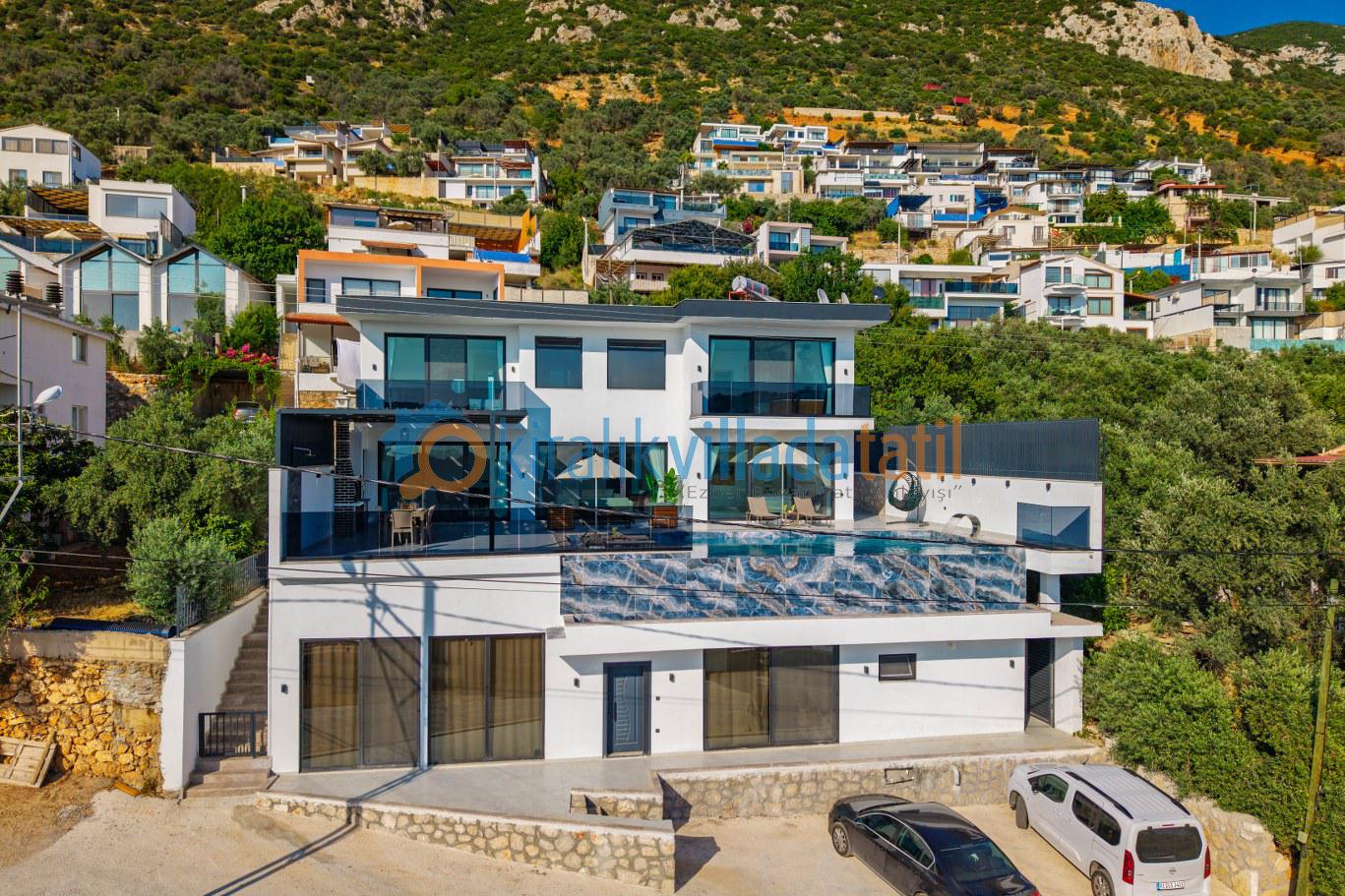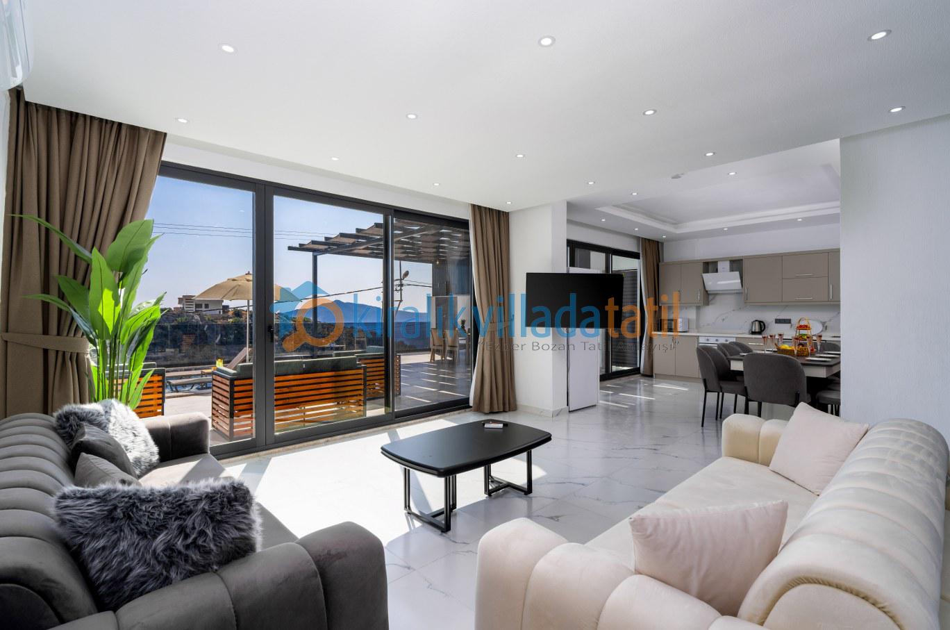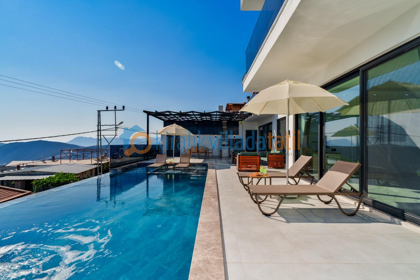 Villanın dış yaşam alanı korunaklı yüzme havuzu,sahiptir.Havuz terasında bulunan şezlonglar, oturma grubu ve geniş güneşlenme alanı gün boyu Akdeniz güneşinin keyfini çıkarabileceğiniz bir ortam oluşturur. Havuz başında yer alan mangal alanı ve geniş yemek masası, sevdiklerinizle birlikte keyifli akşam yemekleri ve uzun sohbetler için ideal bir atmosfer sağlar. Villanın iç mekânı modern ve konforlu bir anlayışla tasarlanmıştır. Geniş ve ferah salon bölümü, modern mutfak ile birleşerek misafirlere ev konforunda bir yaşam alanı sunar. Büyük cam yüzeyler sayesinde gün boyu doğal ışık alan yaşam alanlarında, Kalkan’ın eşsiz deniz manzarası adeta iç mekânın bir parçası haline gelir.