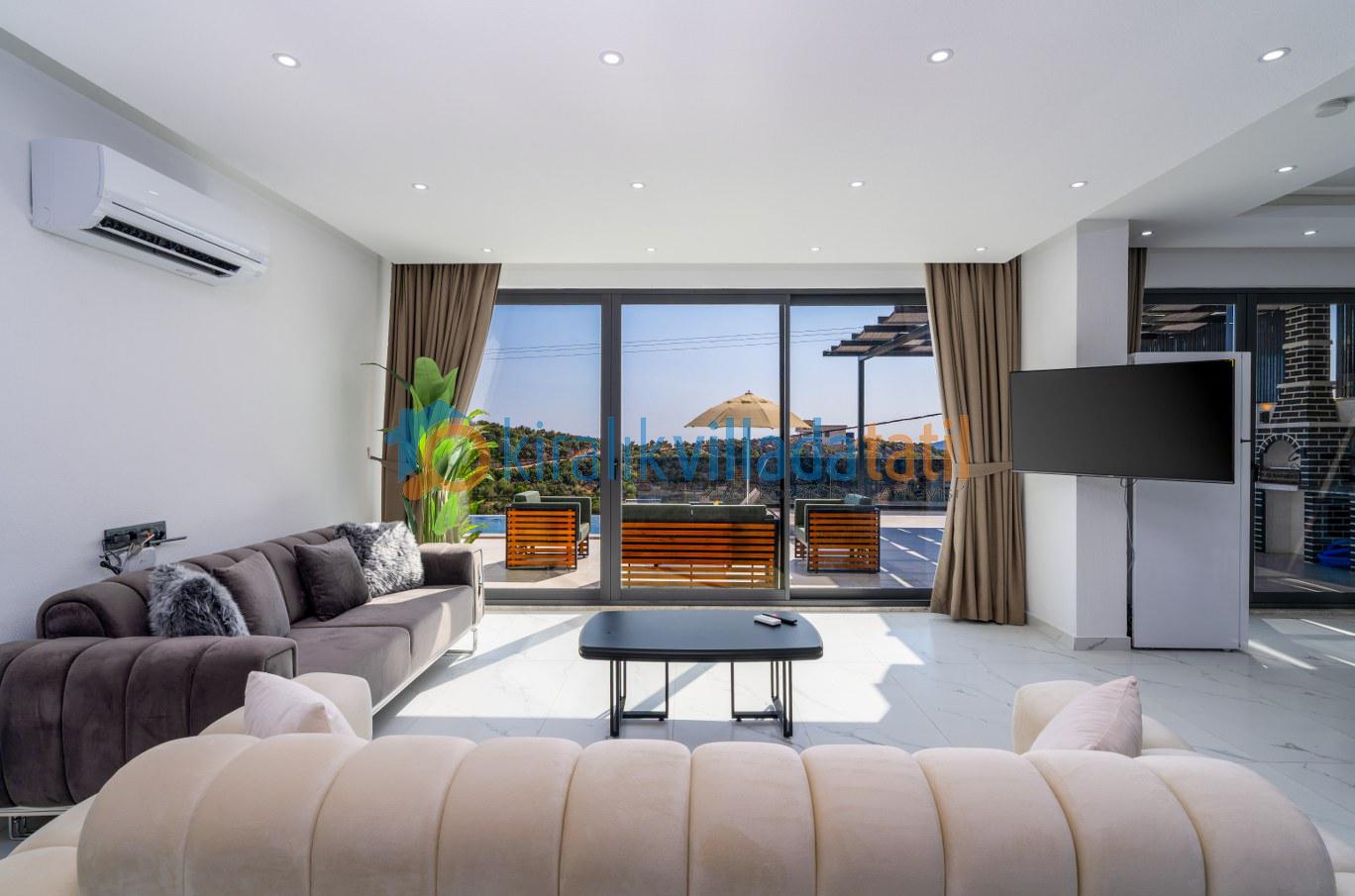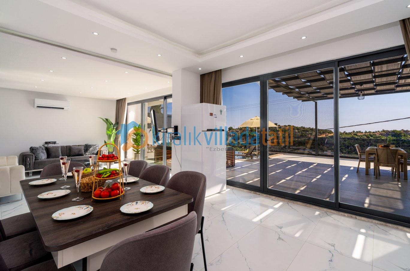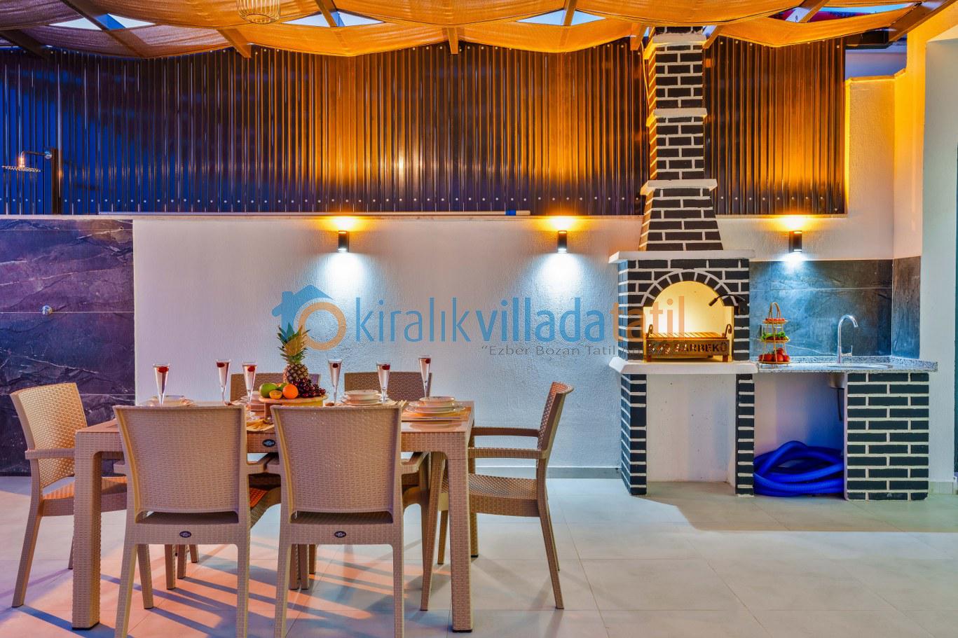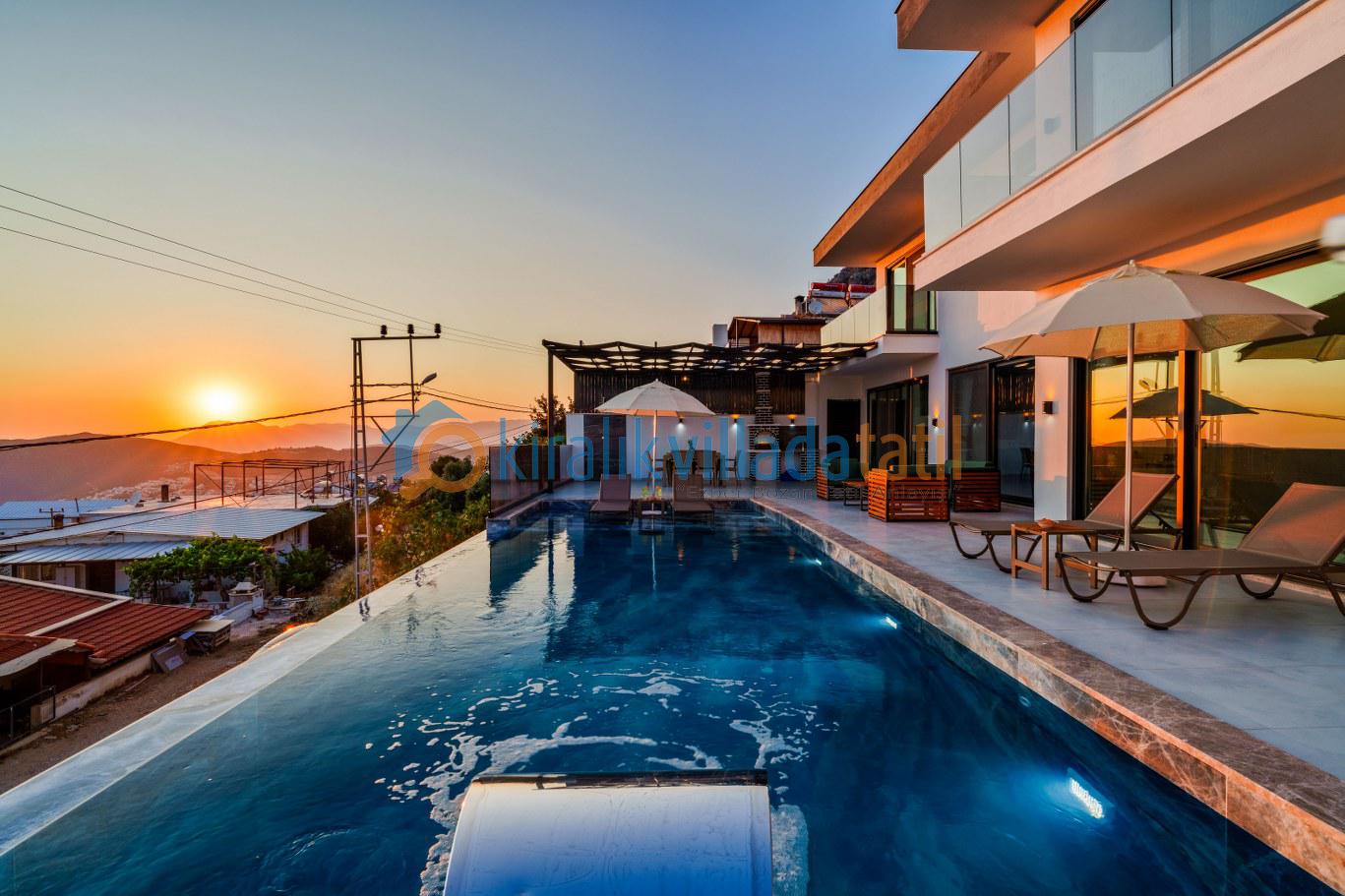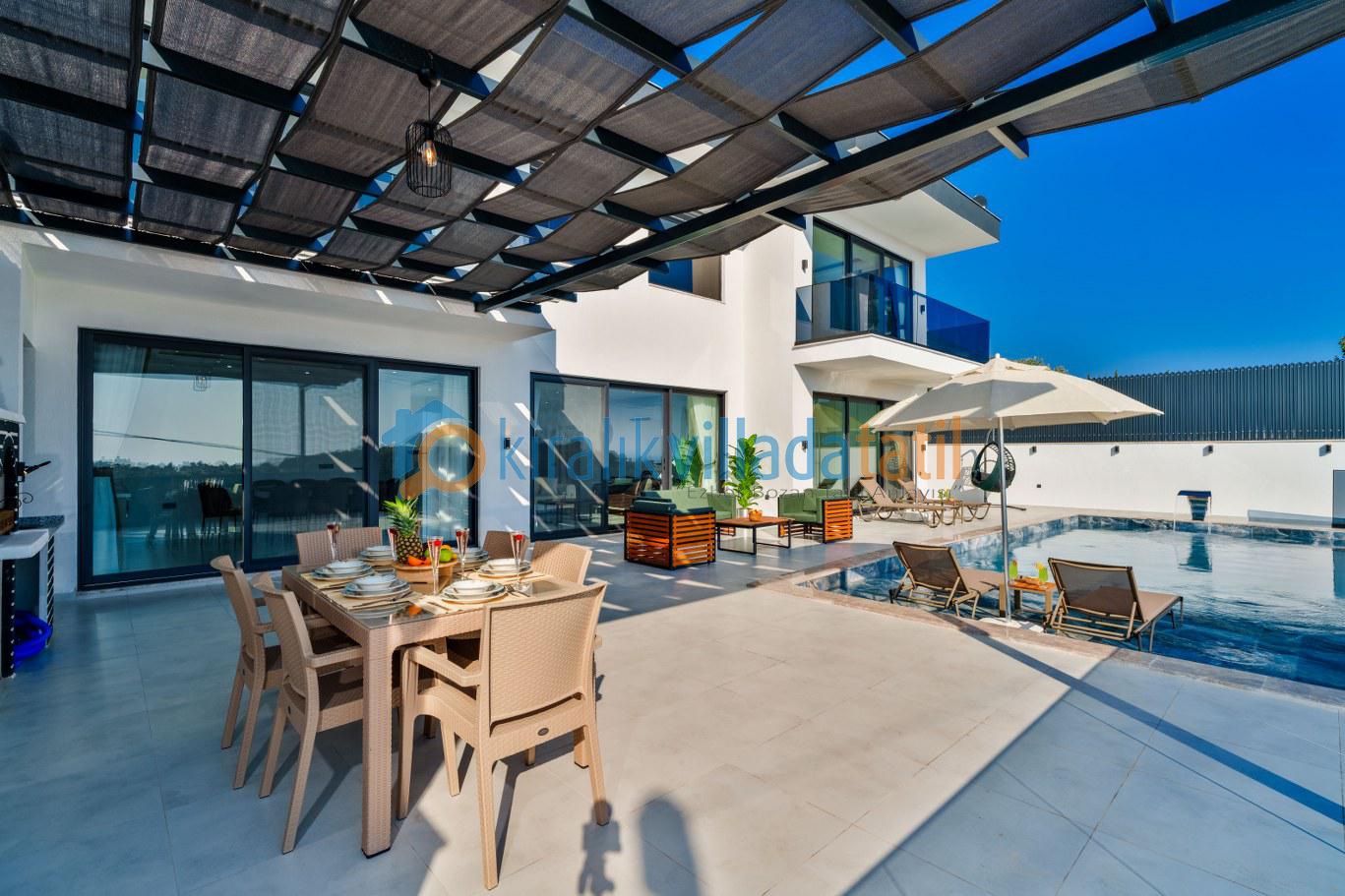 Villanın dış yaşam alanı korunaklı yüzme havuzu,sahiptir.Havuz terasında bulunan şezlonglar, oturma grubu ve geniş güneşlenme alanı gün boyu Akdeniz güneşinin keyfini çıkarabileceğiniz bir ortam oluşturur. Havuz başında yer alan mangal alanı ve geniş yemek masası, sevdiklerinizle birlikte keyifli akşam yemekleri ve uzun sohbetler için ideal bir atmosfer sağlar. Villanın iç mekânı modern ve konforlu bir anlayışla tasarlanmıştır. Geniş ve ferah salon bölümü, modern mutfak ile birleşerek misafirlere ev konforunda bir yaşam alanı sunar. Büyük cam yüzeyler sayesinde gün boyu doğal ışık alan yaşam alanlarında, Kalkan’ın eşsiz deniz manzarası adeta iç mekânın bir parçası haline gelir.