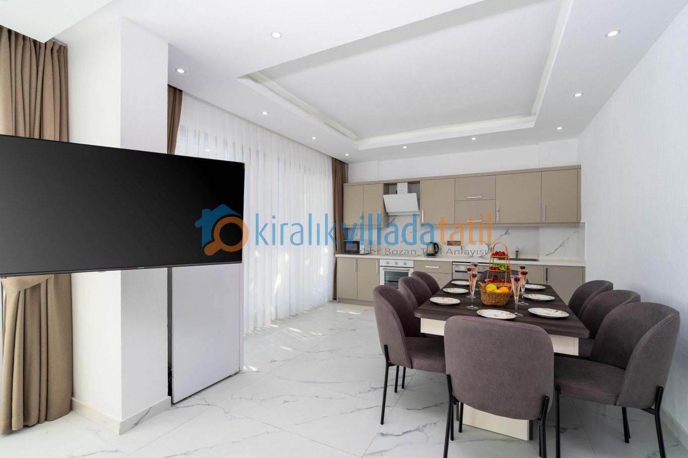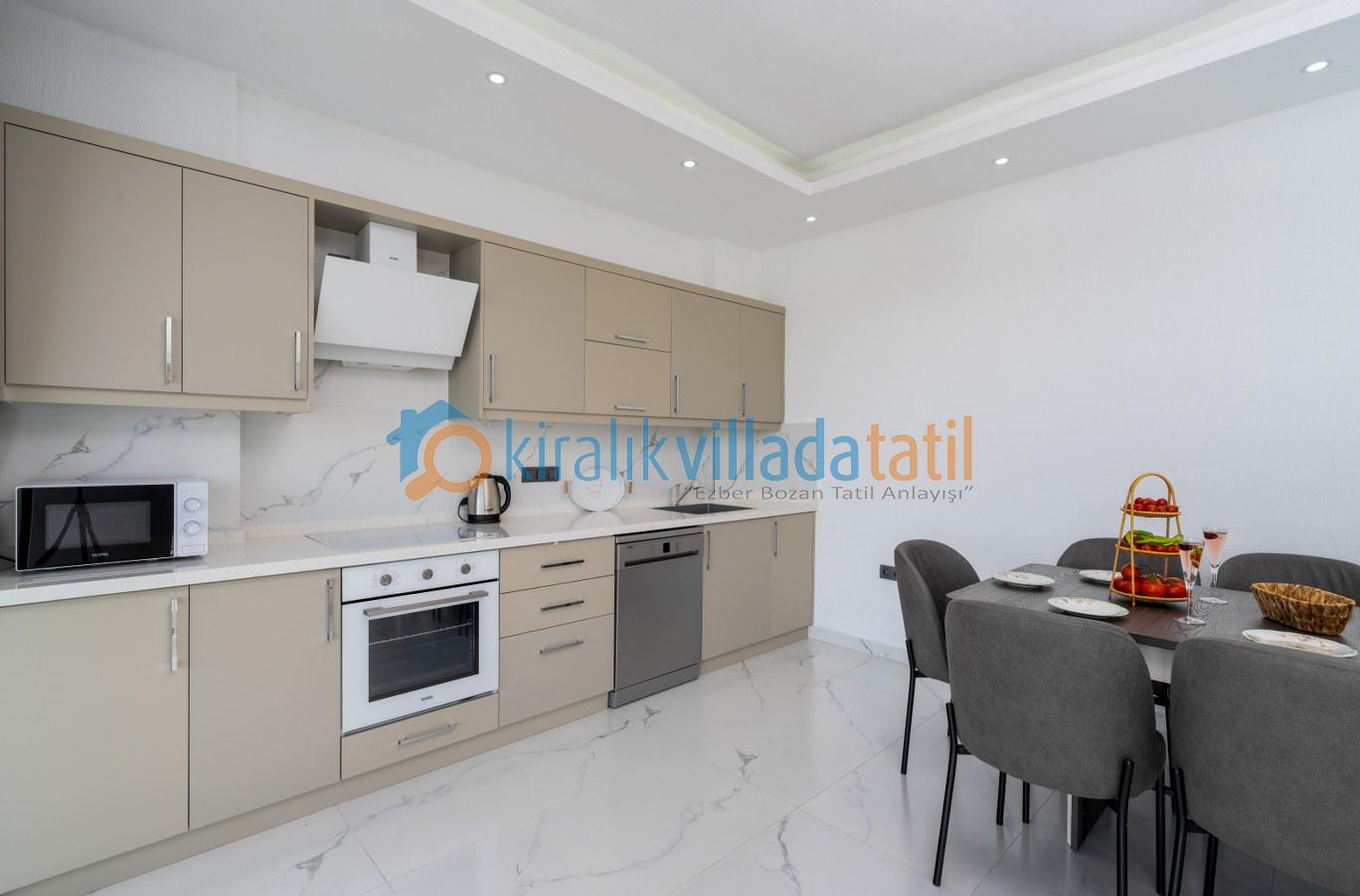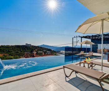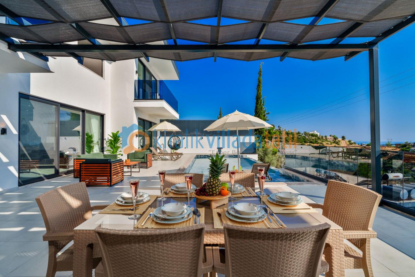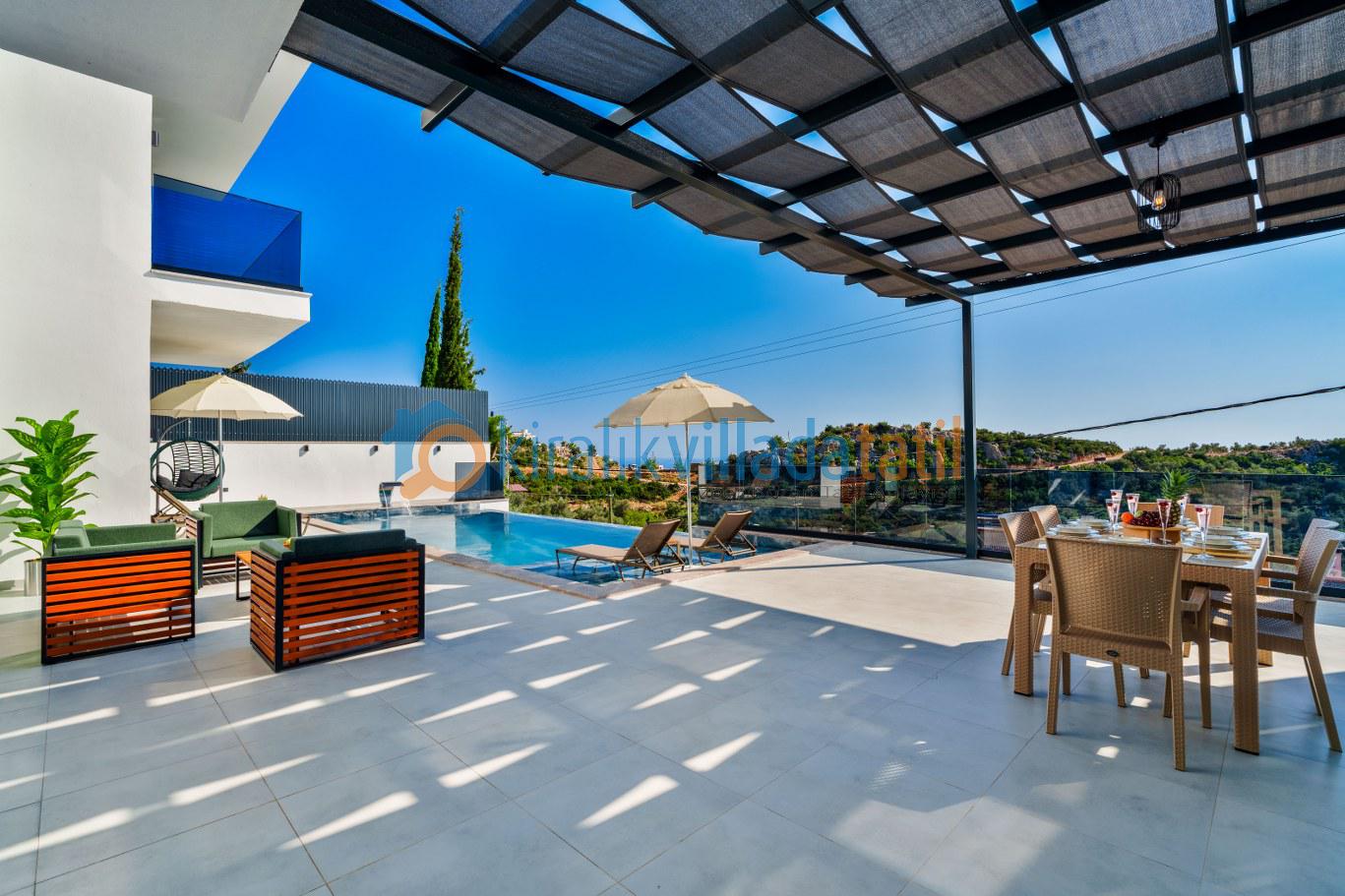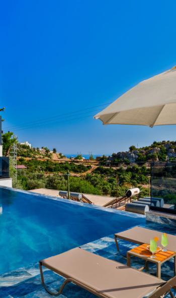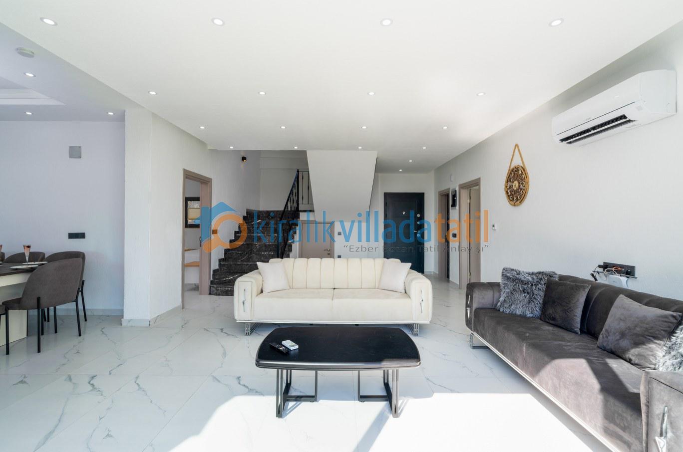 Villanın dış yaşam alanı korunaklı yüzme havuzu,sahiptir.Havuz terasında bulunan şezlonglar, oturma grubu ve geniş güneşlenme alanı gün boyu Akdeniz güneşinin keyfini çıkarabileceğiniz bir ortam oluşturur. Havuz başında yer alan mangal alanı ve geniş yemek masası, sevdiklerinizle birlikte keyifli akşam yemekleri ve uzun sohbetler için ideal bir atmosfer sağlar. Villanın iç mekânı modern ve konforlu bir anlayışla tasarlanmıştır. Geniş ve ferah salon bölümü, modern mutfak ile birleşerek misafirlere ev konforunda bir yaşam alanı sunar. Büyük cam yüzeyler sayesinde gün boyu doğal ışık alan yaşam alanlarında, Kalkan’ın eşsiz deniz manzarası adeta iç mekânın bir parçası haline gelir.