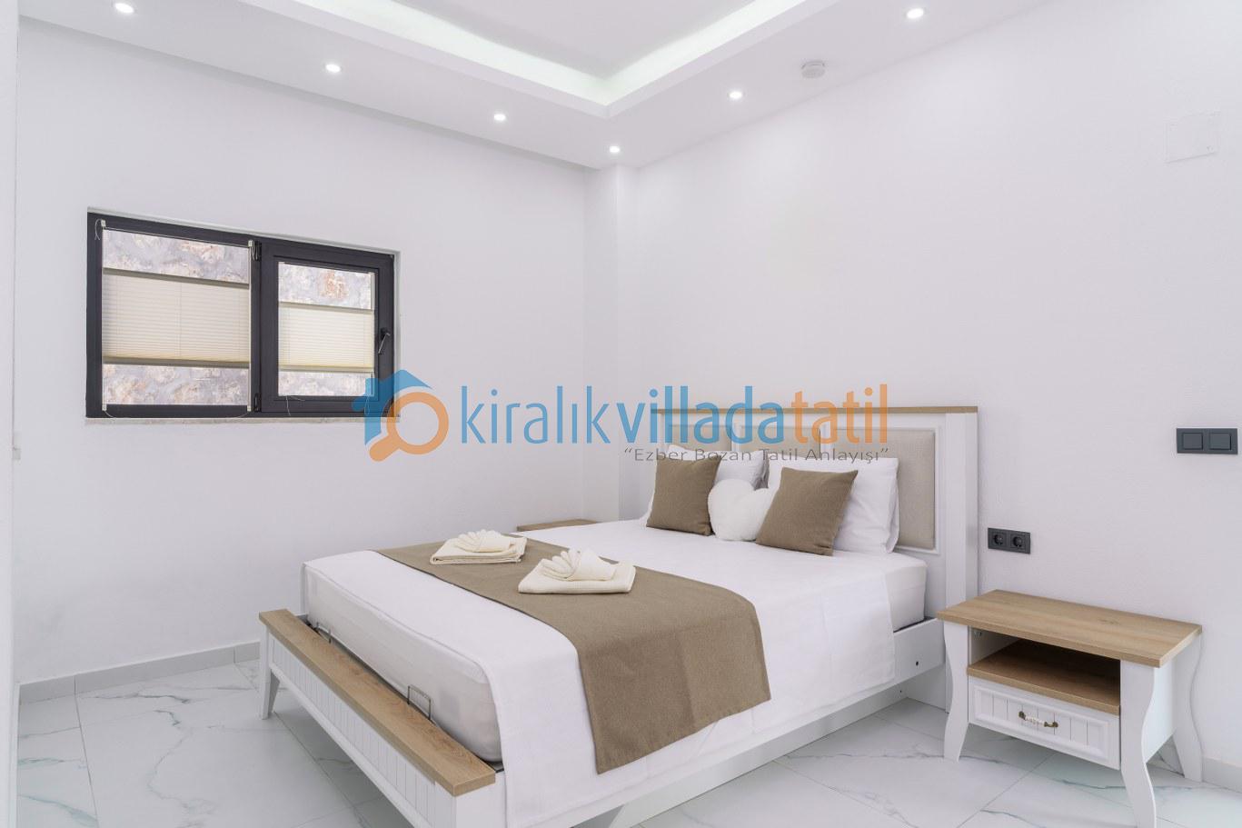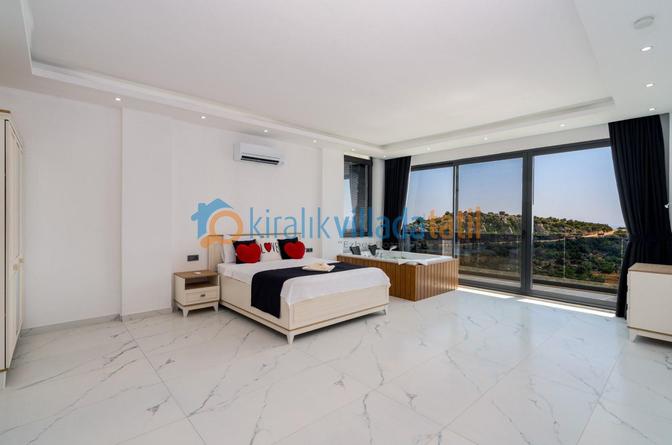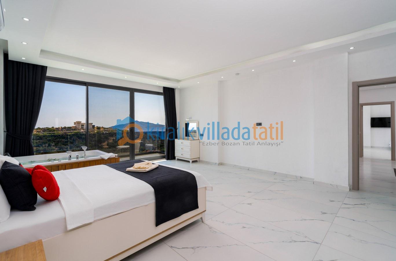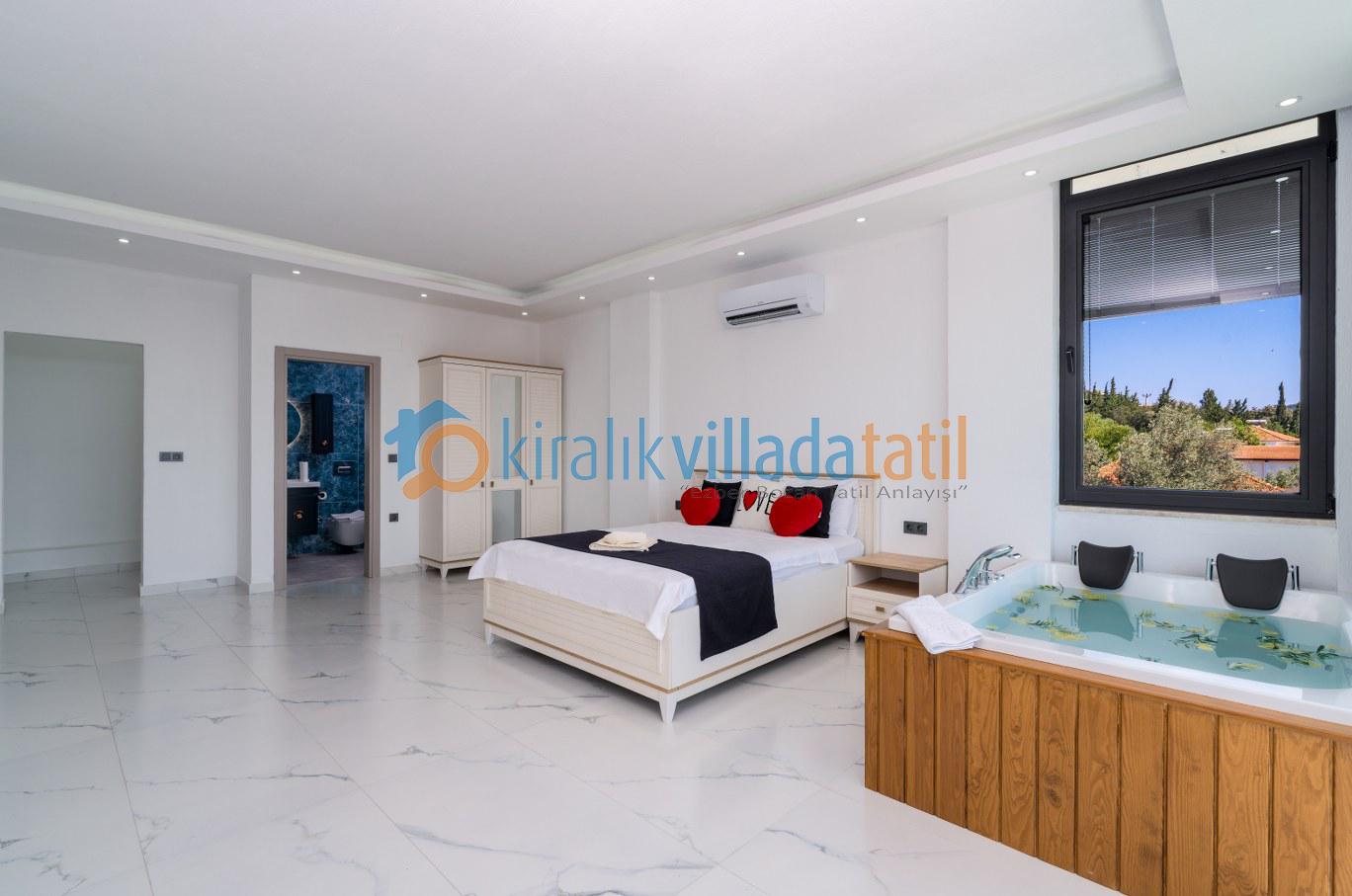 Yatak odaları konfor ve rahatlık düşünülerek hazırlanmış olup, odalardan birinde bulunan jakuzi misafirlere günün yorgunluğunu atabilecekleri özel bir dinlenme alanı sunmaktadır. Ayrıca villada bulunan sauna ve hamam konseptinde tasarlanmış banyo alanı, tatilinizi daha da keyifli hale getiren lüks detaylar arasında yer almaktadır. Bu özellikleri sayesinde villa, hem dinlenmek hem de konforlu bir tatil geçirmek isteyen misafirler için ayrıcalıklı bir ortam sunar. Deniz manzarası eşliğinde huzurlu bir atmosfer sunan villamız, Kalkan merkeze araç ile yaklaşık 10 dakika sürüş mesafesinde yer almaktadır. Bu sayede hem sakin ve doğa ile iç içe bir konumda tatilinizi geçirebilir hem de kısa bir yolculukla Kalkan’ın restoranlarına, plajlarına ve eğlence noktalarına kolayca ulaşabilirsiniz.