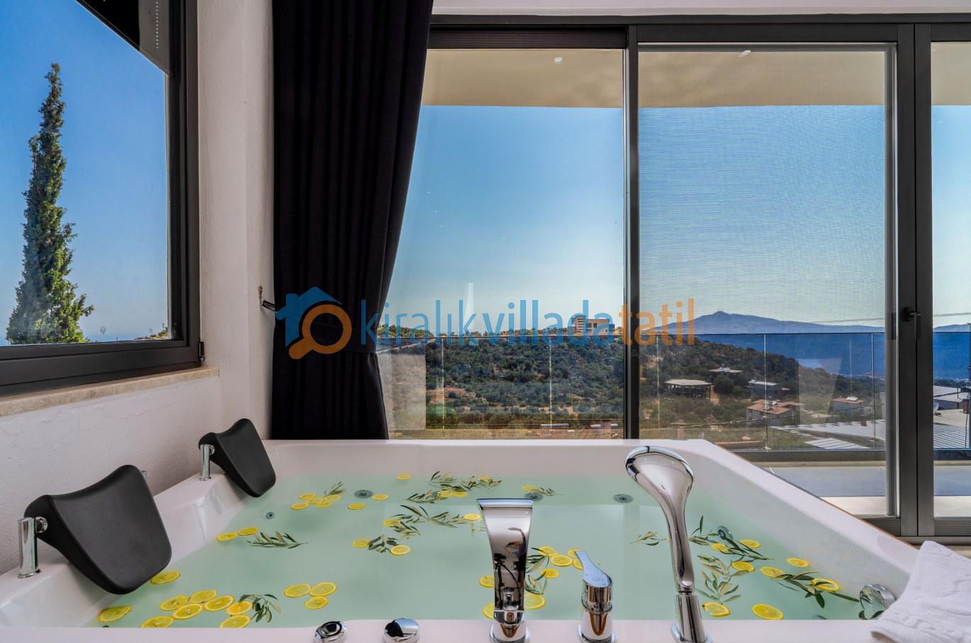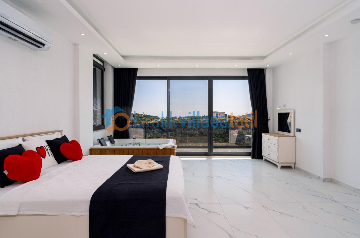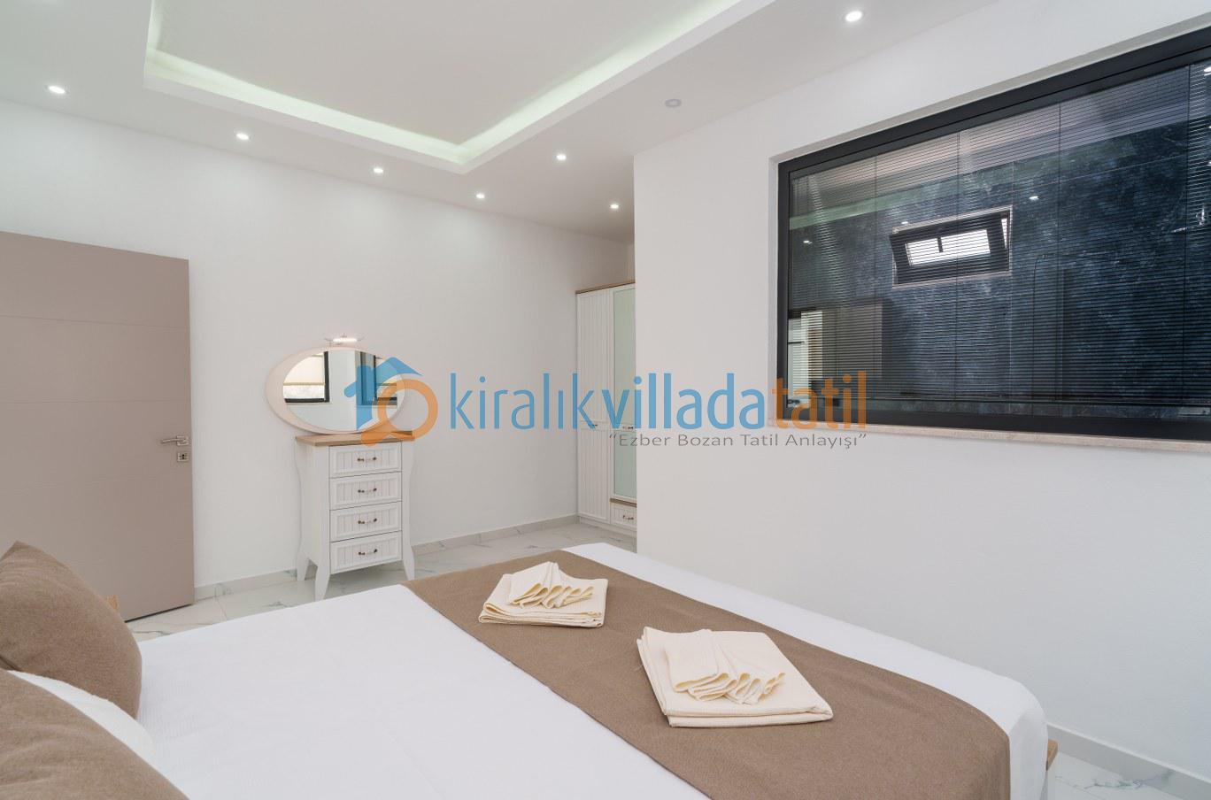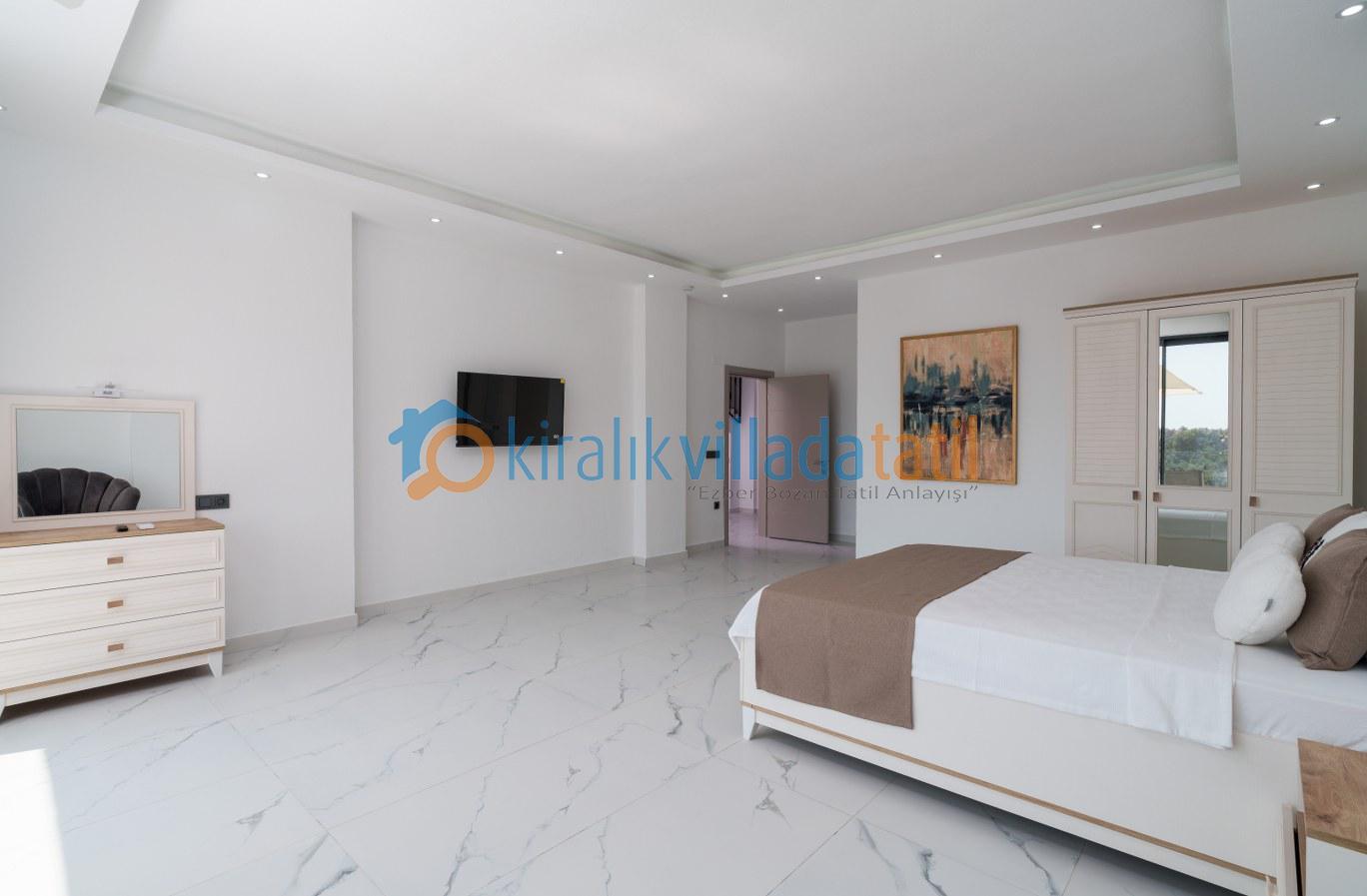 Yatak odaları konfor ve rahatlık düşünülerek hazırlanmış olup, odalardan birinde bulunan jakuzi misafirlere günün yorgunluğunu atabilecekleri özel bir dinlenme alanı sunmaktadır. Ayrıca villada bulunan sauna ve hamam konseptinde tasarlanmış banyo alanı, tatilinizi daha da keyifli hale getiren lüks detaylar arasında yer almaktadır. Bu özellikleri sayesinde villa, hem dinlenmek hem de konforlu bir tatil geçirmek isteyen misafirler için ayrıcalıklı bir ortam sunar. Deniz manzarası eşliğinde huzurlu bir atmosfer sunan villamız, Kalkan merkeze araç ile yaklaşık 10 dakika sürüş mesafesinde yer almaktadır. Bu sayede hem sakin ve doğa ile iç içe bir konumda tatilinizi geçirebilir hem de kısa bir yolculukla Kalkan’ın restoranlarına, plajlarına ve eğlence noktalarına kolayca ulaşabilirsiniz.