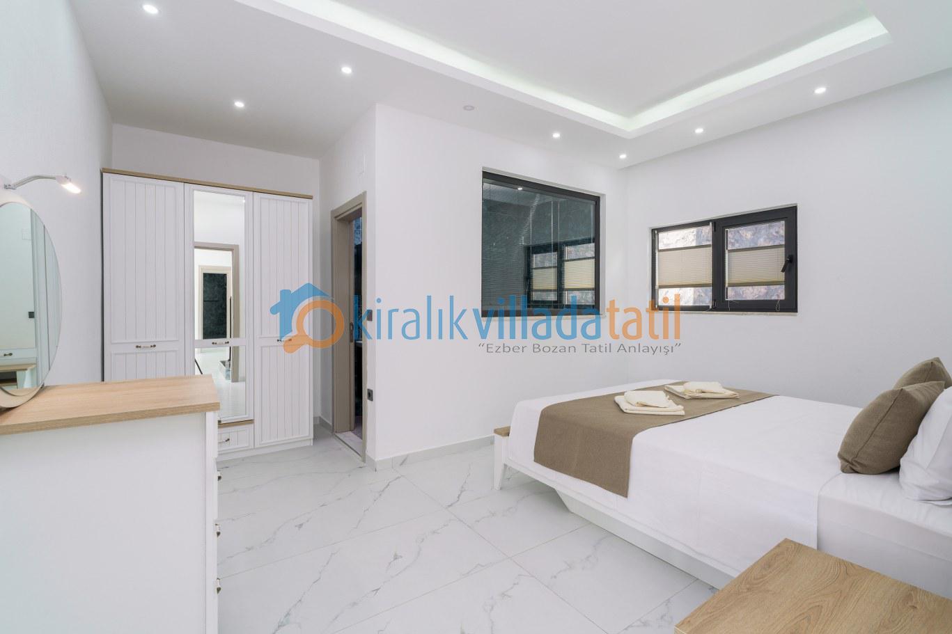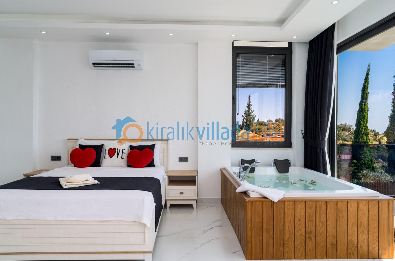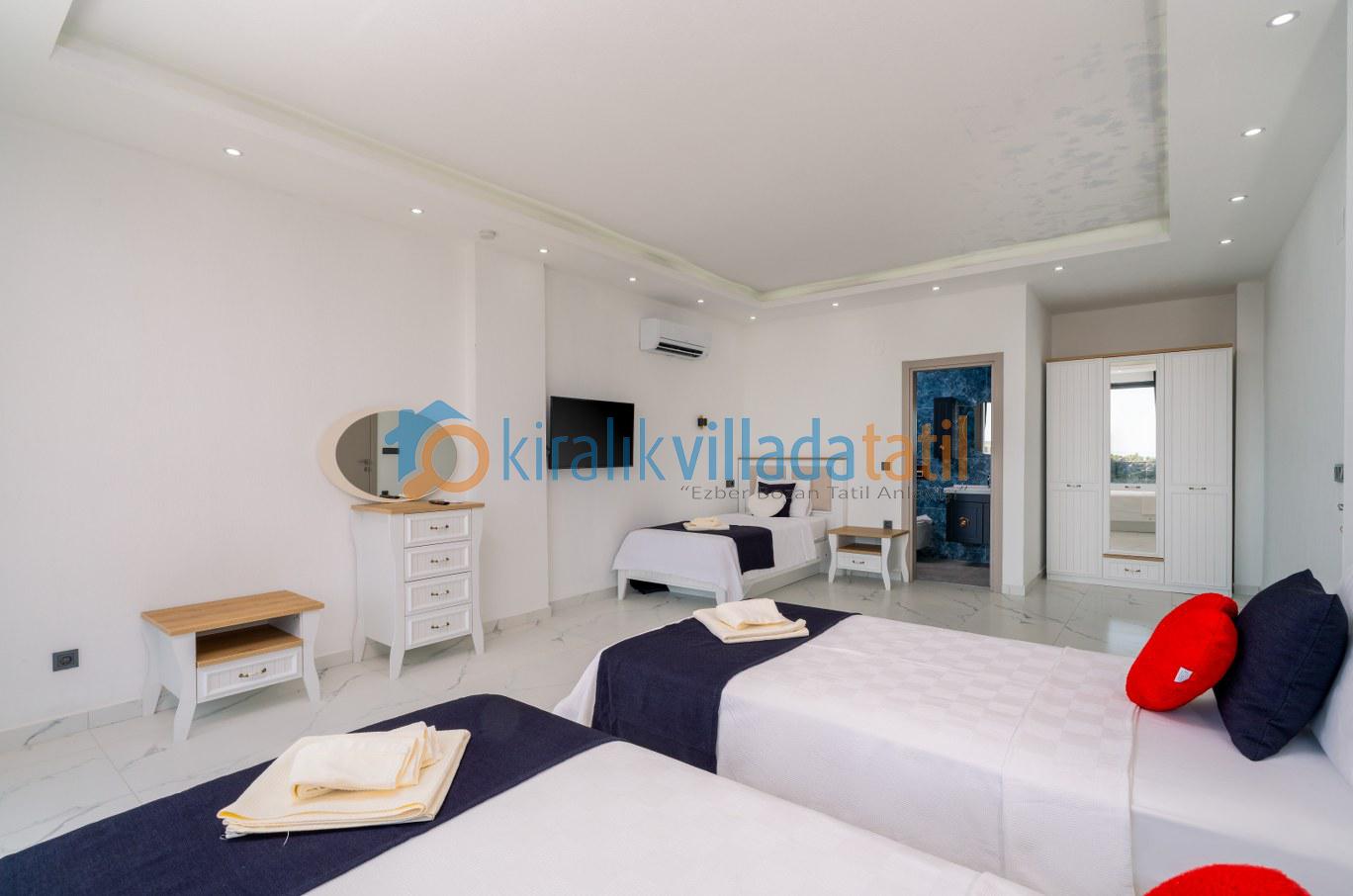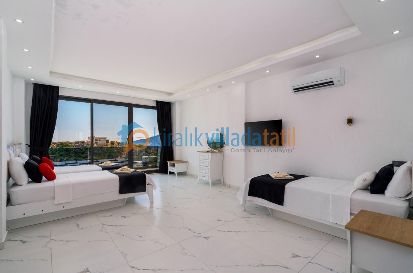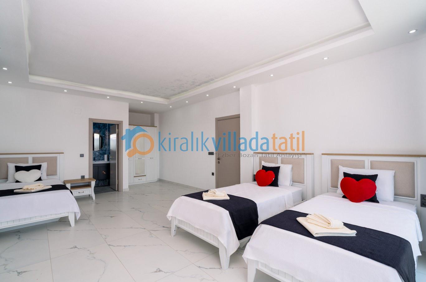 Yatak odaları konfor ve rahatlık düşünülerek hazırlanmış olup, odalardan birinde bulunan jakuzi misafirlere günün yorgunluğunu atabilecekleri özel bir dinlenme alanı sunmaktadır. Ayrıca villada bulunan sauna ve hamam konseptinde tasarlanmış banyo alanı, tatilinizi daha da keyifli hale getiren lüks detaylar arasında yer almaktadır. Bu özellikleri sayesinde villa, hem dinlenmek hem de konforlu bir tatil geçirmek isteyen misafirler için ayrıcalıklı bir ortam sunar. Deniz manzarası eşliğinde huzurlu bir atmosfer sunan villamız, Kalkan merkeze araç ile yaklaşık 10 dakika sürüş mesafesinde yer almaktadır. Bu sayede hem sakin ve doğa ile iç içe bir konumda tatilinizi geçirebilir hem de kısa bir yolculukla Kalkan’ın restoranlarına, plajlarına ve eğlence noktalarına kolayca ulaşabilirsiniz.