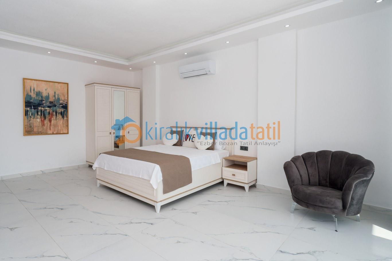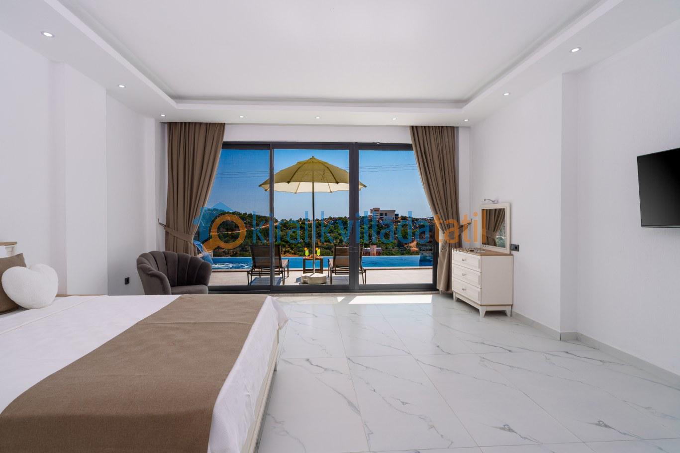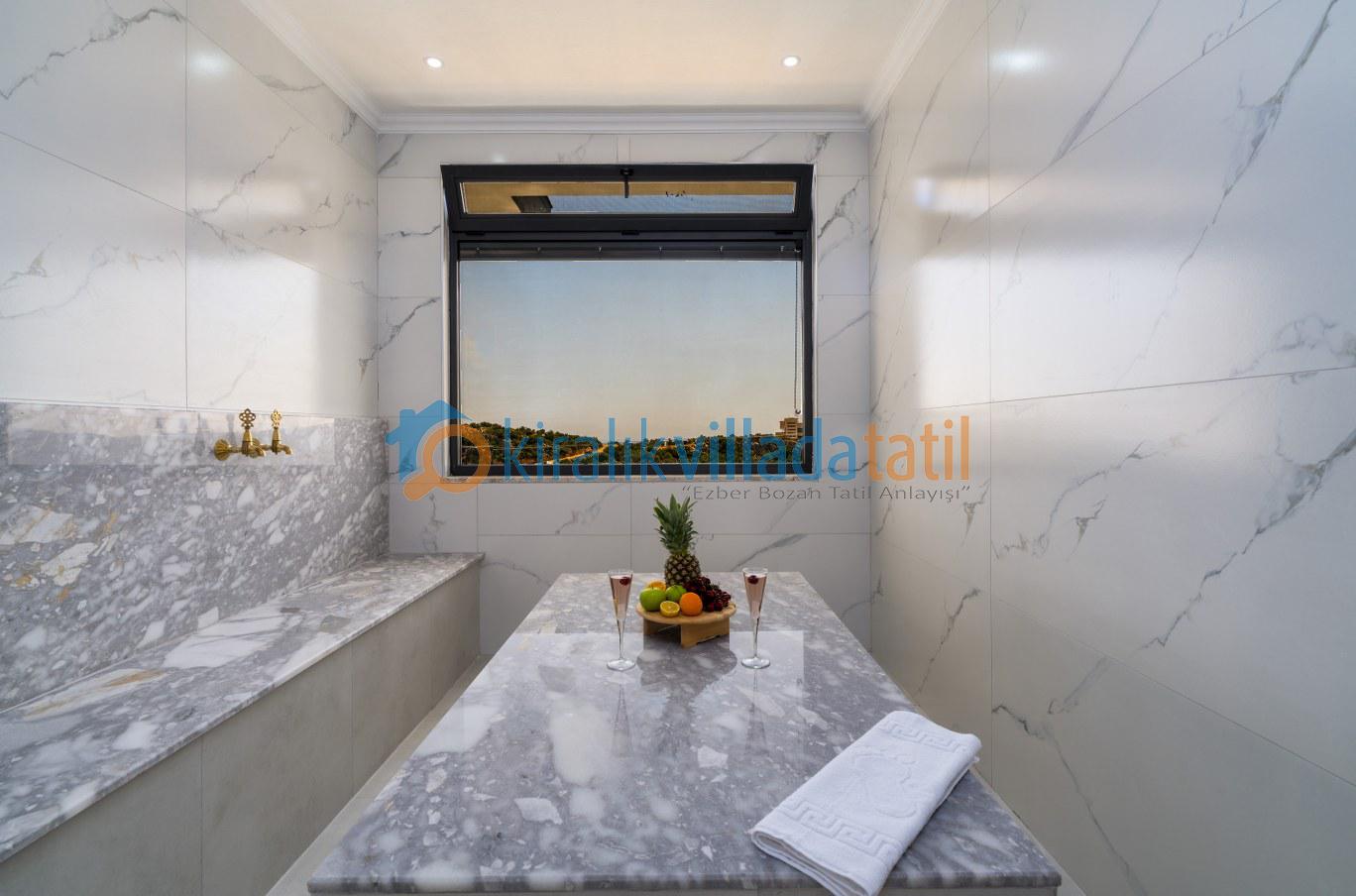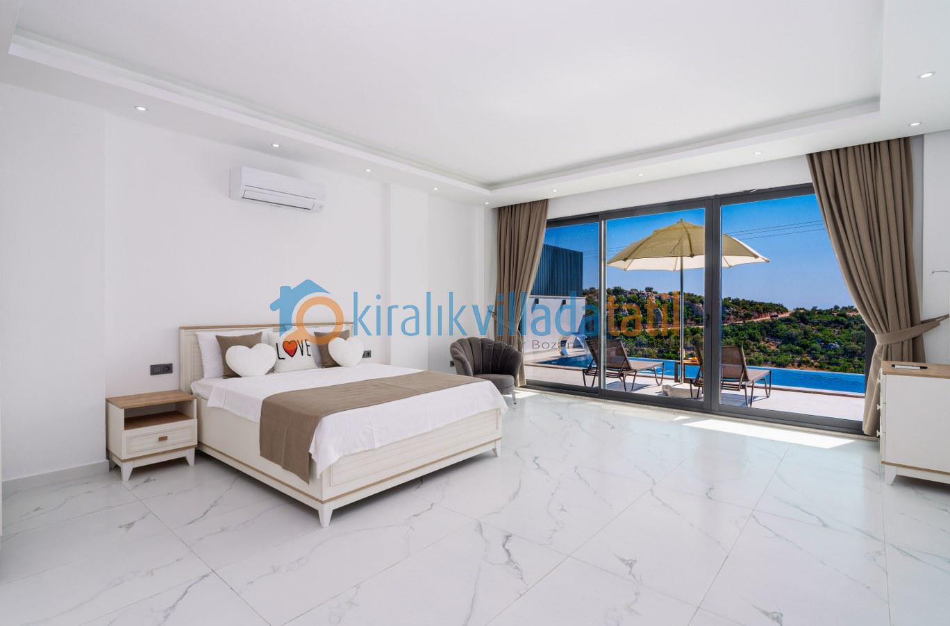 Yatak odaları konfor ve rahatlık düşünülerek hazırlanmış olup, odalardan birinde bulunan jakuzi misafirlere günün yorgunluğunu atabilecekleri özel bir dinlenme alanı sunmaktadır. Ayrıca villada bulunan sauna ve hamam konseptinde tasarlanmış banyo alanı, tatilinizi daha da keyifli hale getiren lüks detaylar arasında yer almaktadır. Bu özellikleri sayesinde villa, hem dinlenmek hem de konforlu bir tatil geçirmek isteyen misafirler için ayrıcalıklı bir ortam sunar. Deniz manzarası eşliğinde huzurlu bir atmosfer sunan villamız, Kalkan merkeze araç ile yaklaşık 10 dakika sürüş mesafesinde yer almaktadır. Bu sayede hem sakin ve doğa ile iç içe bir konumda tatilinizi geçirebilir hem de kısa bir yolculukla Kalkan’ın restoranlarına, plajlarına ve eğlence noktalarına kolayca ulaşabilirsiniz.
