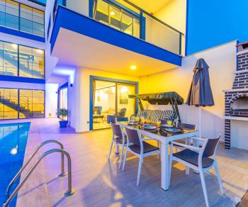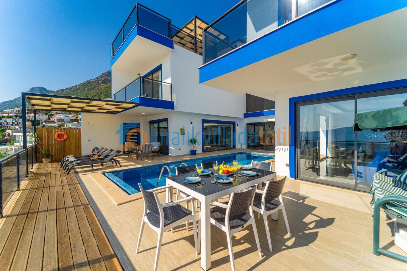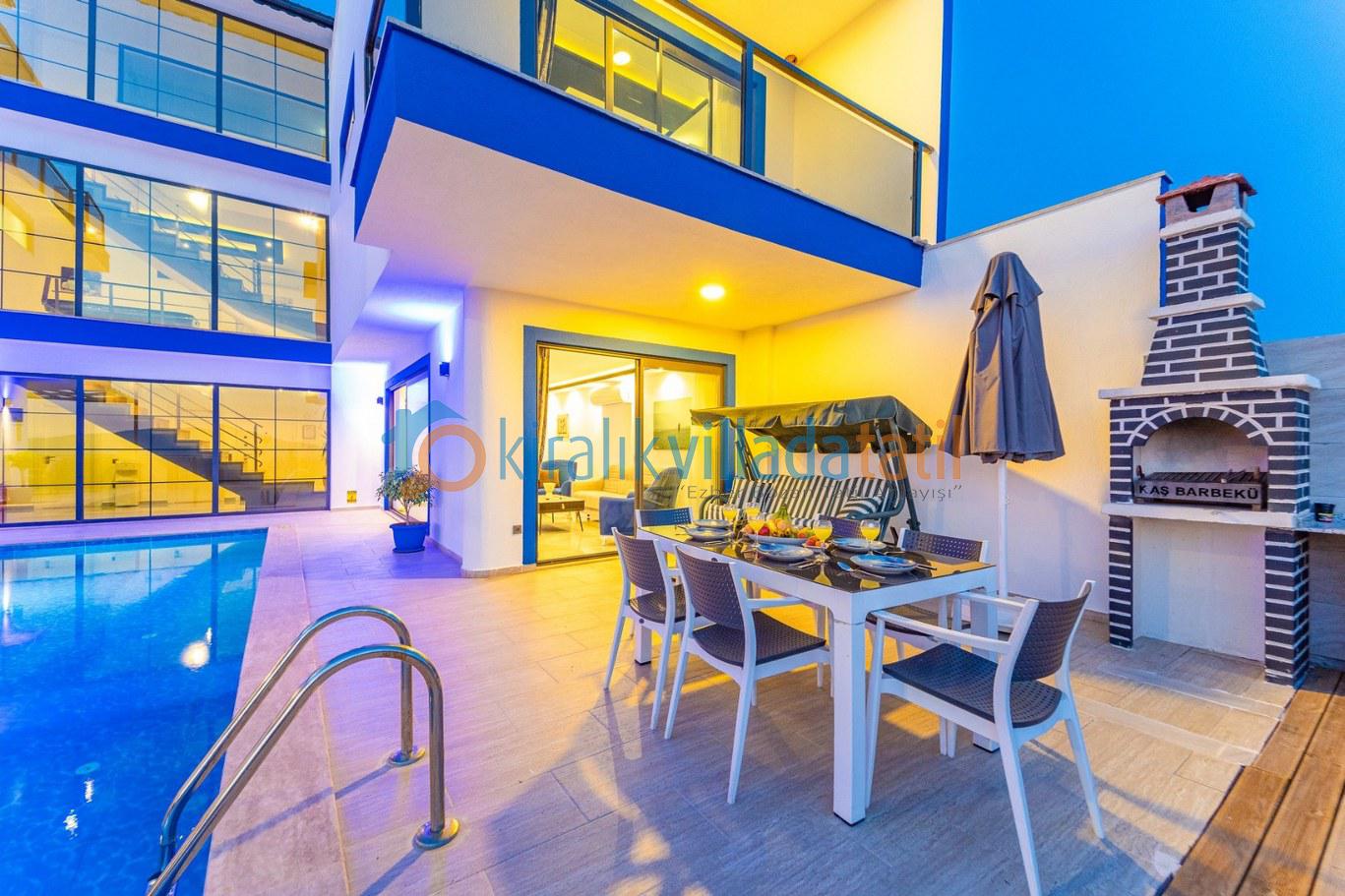 U şeklinde olan modern mimarisi ile dış havuz terası dış gözlerden büyük oranda izole edilmiştir, havuz terasında bulunan şezlonglar, bahçe salıncağı, yemek masası ve barbekü alanı ile tamamen size özel bir yaşam alanı sunarak mahremiyet odaklı bir tatil konsepti oluşturur. Bu yönüyle villa, korunaklı yapısıyla gözlerden uzak tatil planlayan misafirler için güçlü bir korunaklı villa alternatifidir.