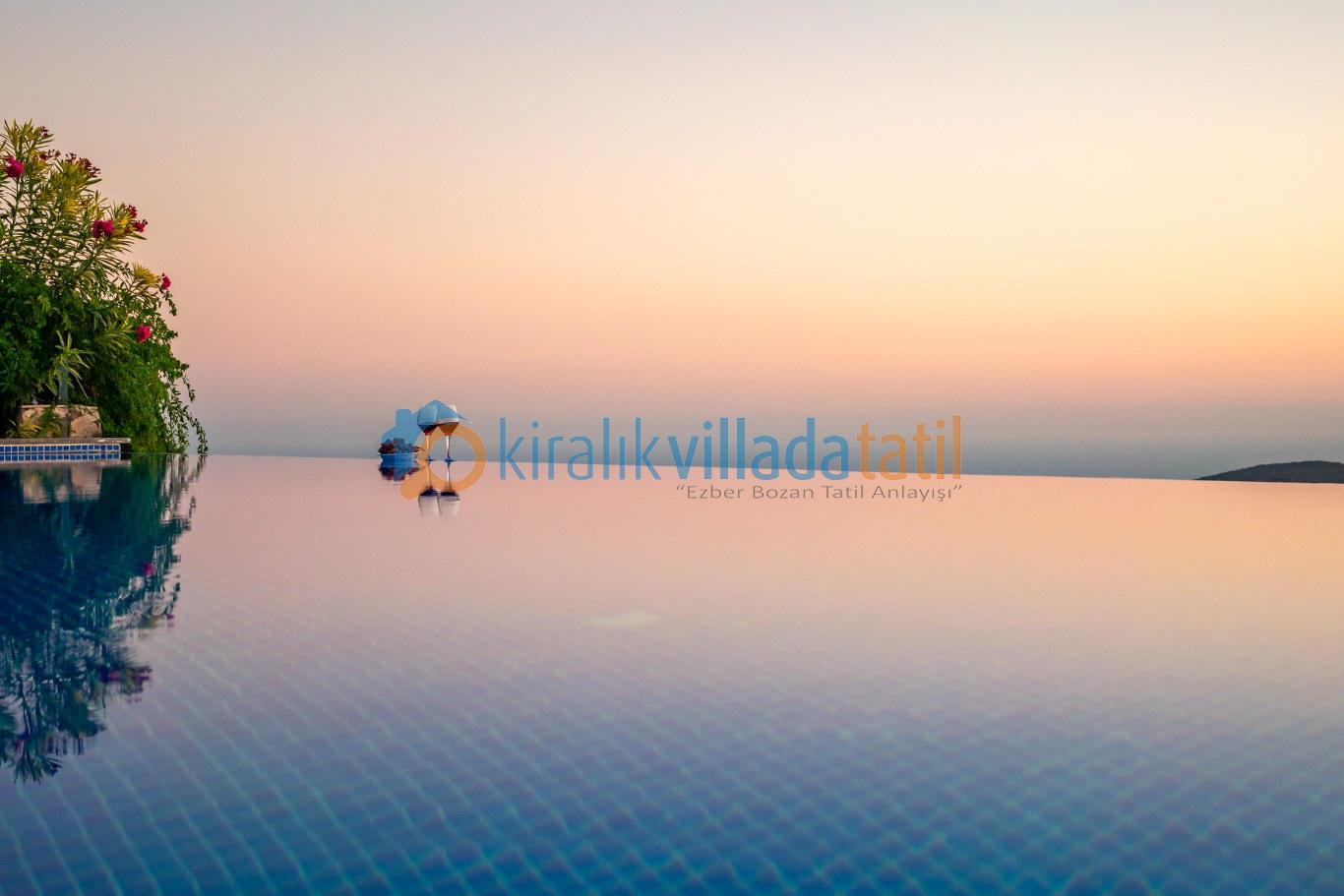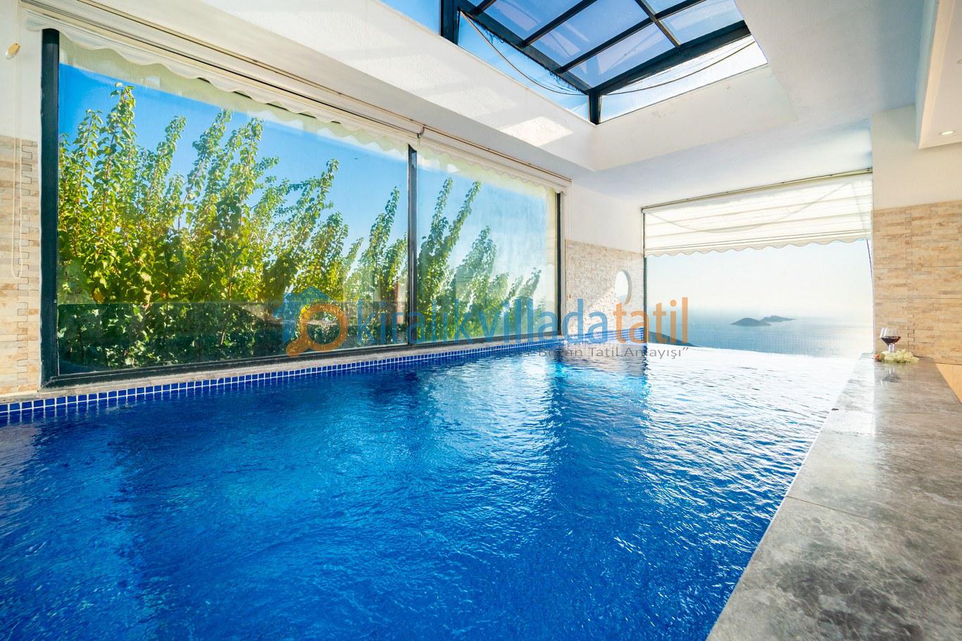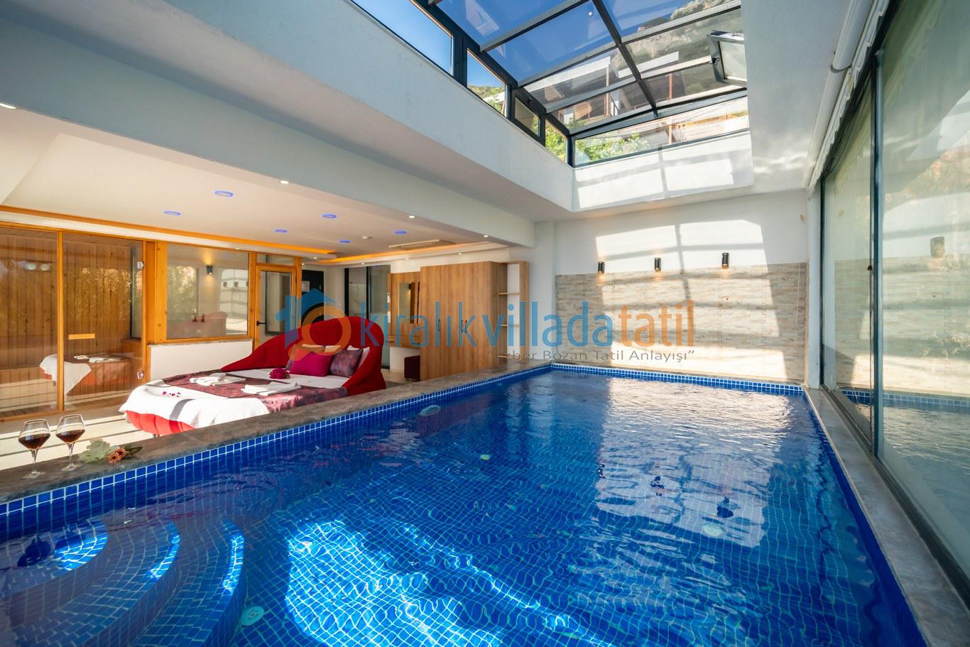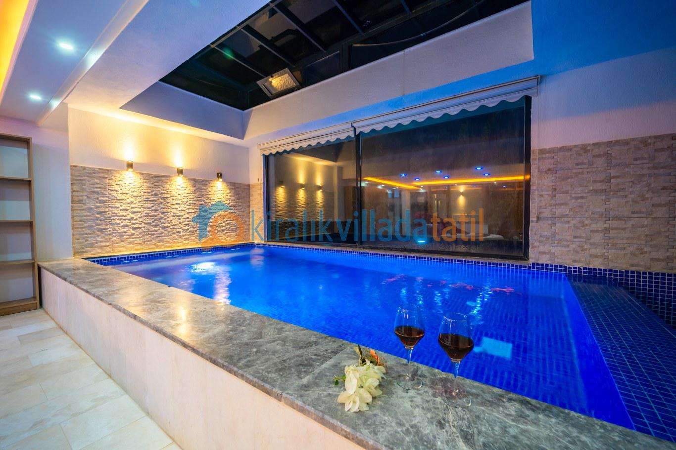 Villanın en öne çıkan özelliği, dört mevsim kullanıma uygun **kapalı ısıtmalı havuzu** ve **sonsuz maviliğe uzanan panoramik deniz manzarasıdır**. Bu özellik, özellikle balayı çiftleri, muhafazakâr aileler ve kış döneminde tatil planlayan misafirler için büyük avantaj sunar.
