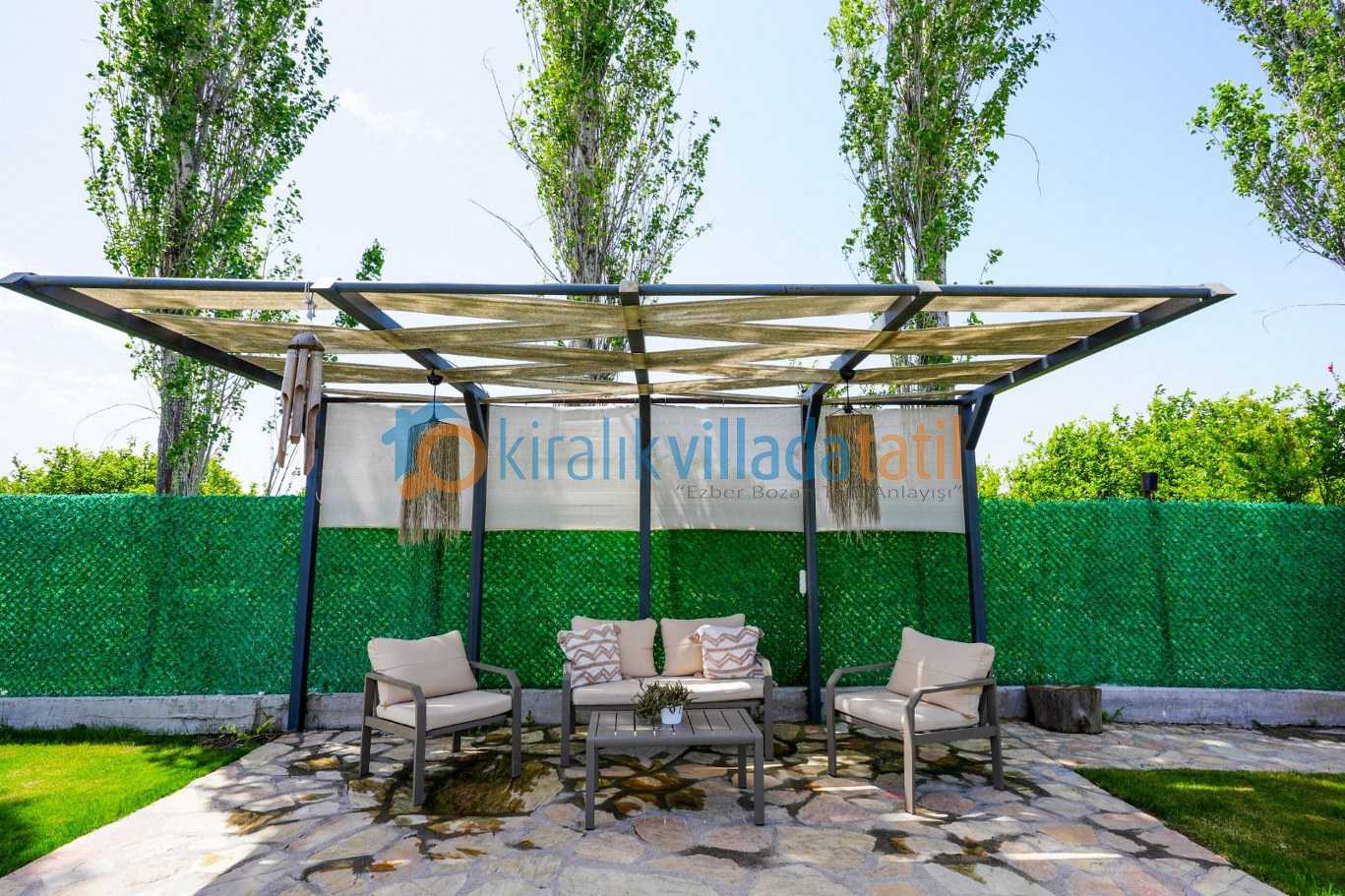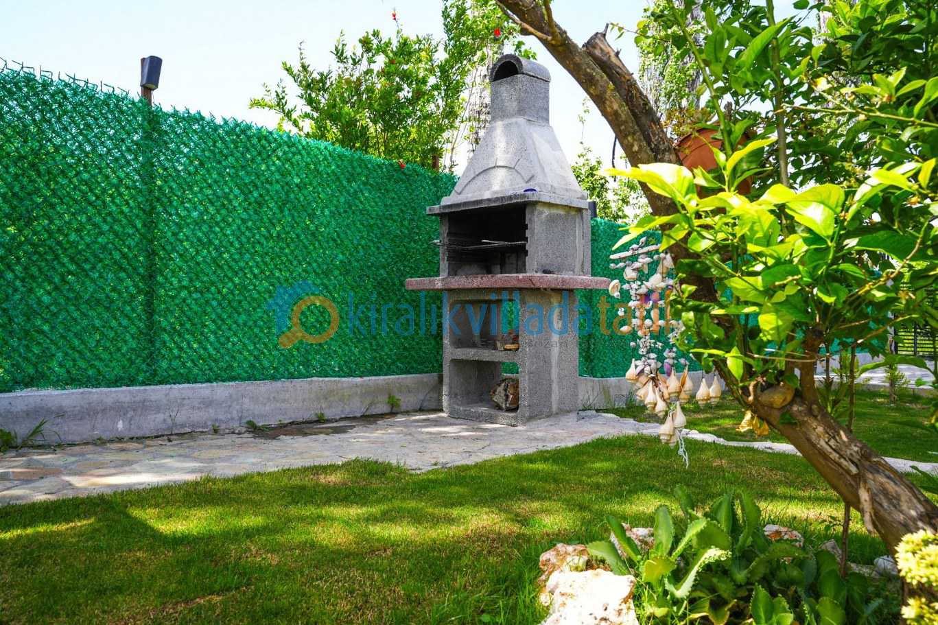 Villanın dış alanı oldukça kullanışlı düşünülmüş. Geniş ve yeşillikler içinde bir bahçe var, burada hem dinlenmek hem de vakit geçirmek gerçekten rahat oluyor. Ayrıca çocuklu aileler için önemli bir detay; 2x2 metre ölçülerinde ve 50 cm derinliğinde ayrı bir çocuk havuzu bulunuyor. Bunun yanında 6 adet şezlong ve güneş şemsiyeleri ile gün boyu dış alanda konforlu zaman geçirmek mümkün. Genel atmosferi sessiz, sakin ve doğa ile iç içe… yani kalabalıktan uzak bir tatil isteyenler için tam yerinde bir villa kiralama seçeneği.