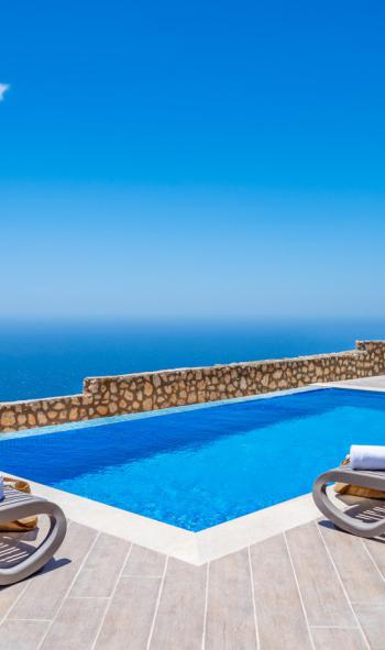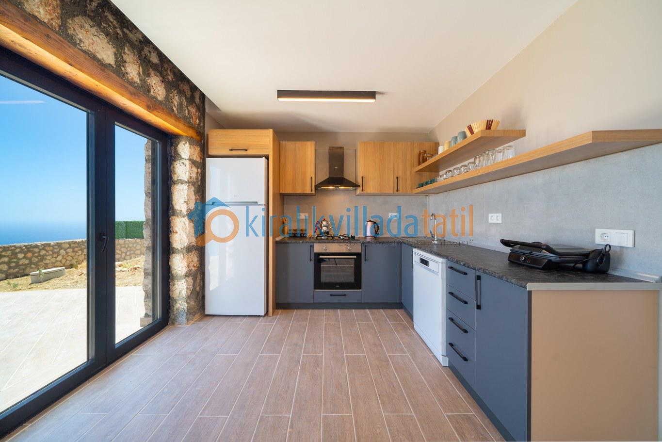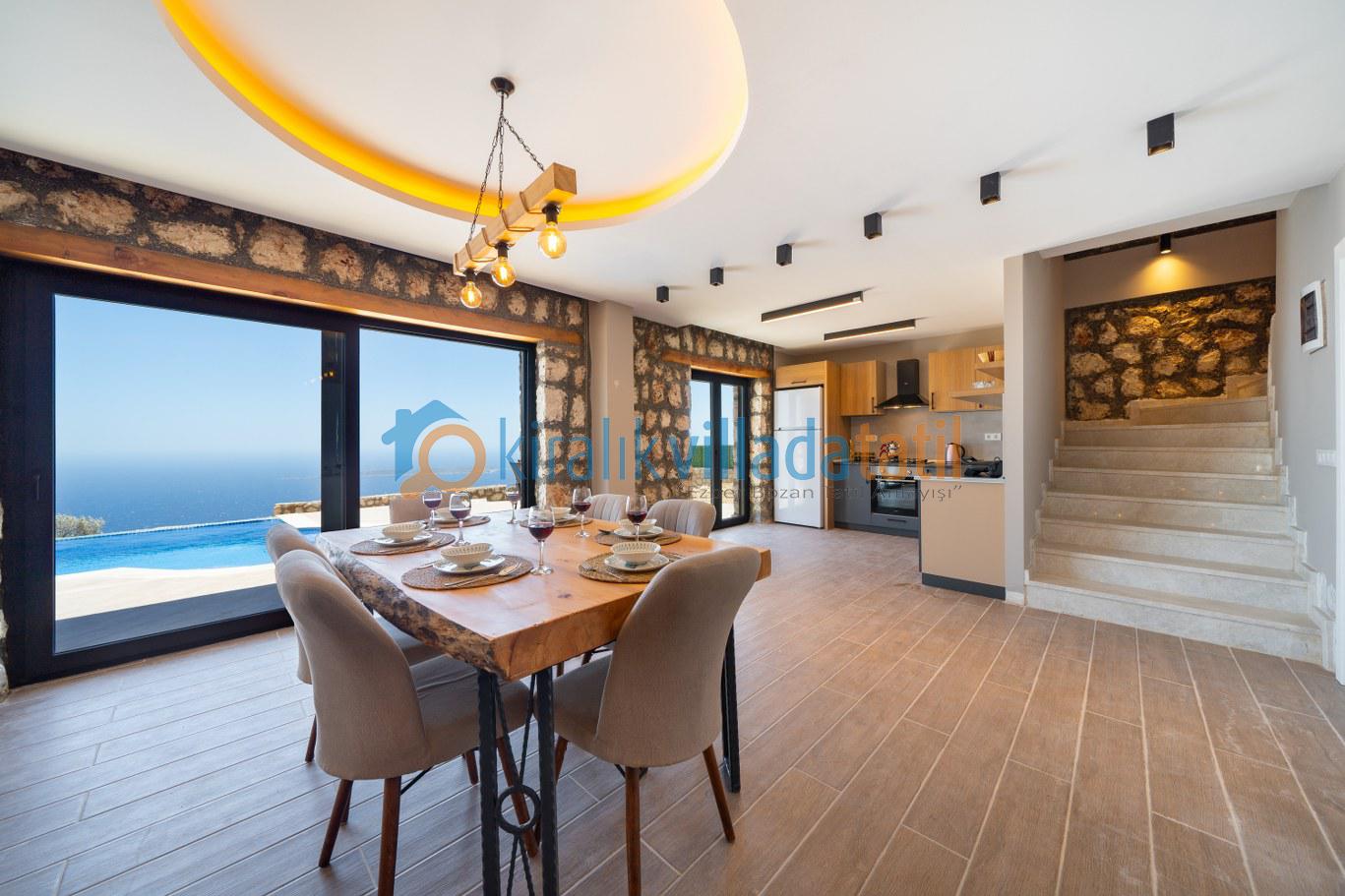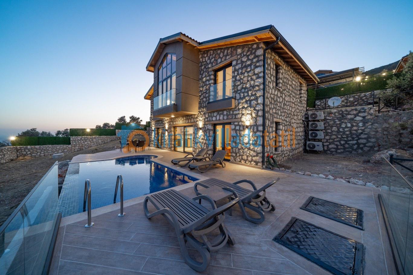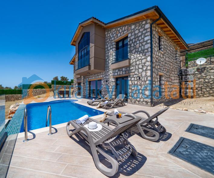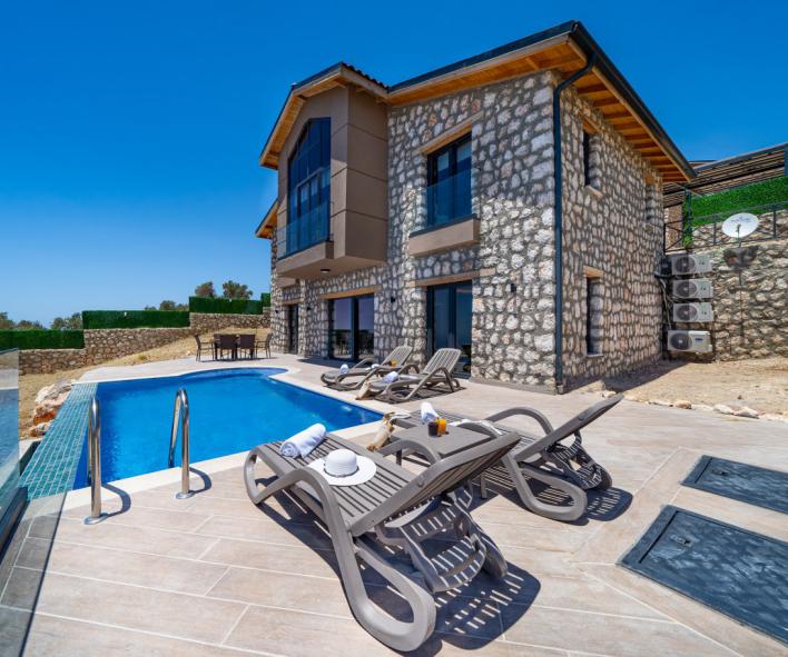 Üç yatak odasıyla toplamda altı kişiye kadar konaklama kapasitesi sunan villa; geniş iç hacmi, doğayla uyumlu mimari kurgusu ve manzaraya açılan dış yaşam alanlarıyla üst düzey konfor hedeflenerek tasarlanmıştır. Dışarıdan görünmeyen özel havuz alanı sayesinde mahremiyet ön planda tutulurken, gün batımında Akdeniz siluetine karşı keyifli vakit geçirebileceğiniz özel alanlar tatilinize değer katar. Doğal taş yüzeyler, ahşap detaylar ve modern dekorasyon öğeleri villanın karakteristik lüks segment kimliğini destekler.