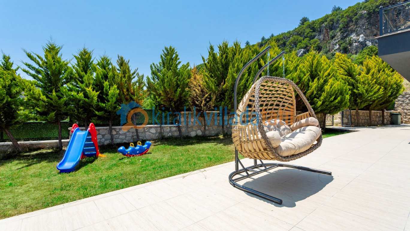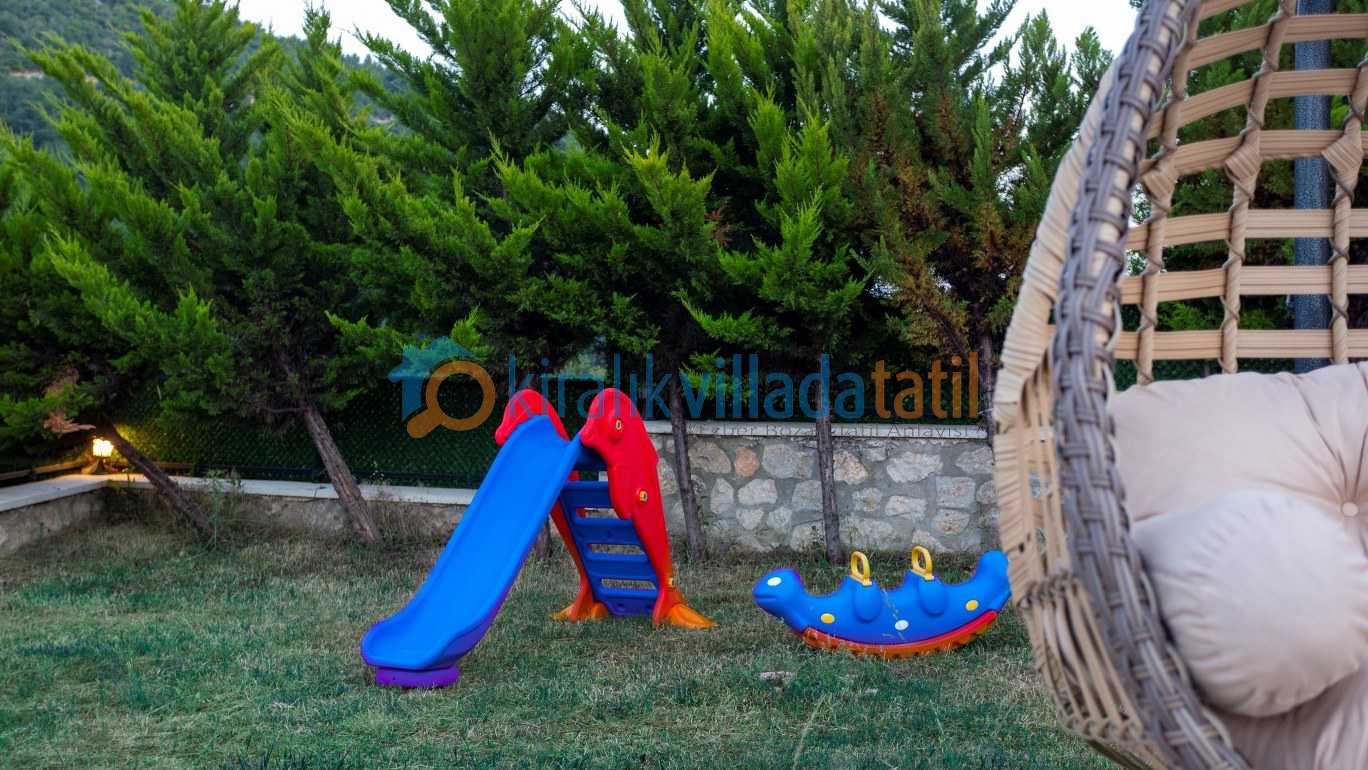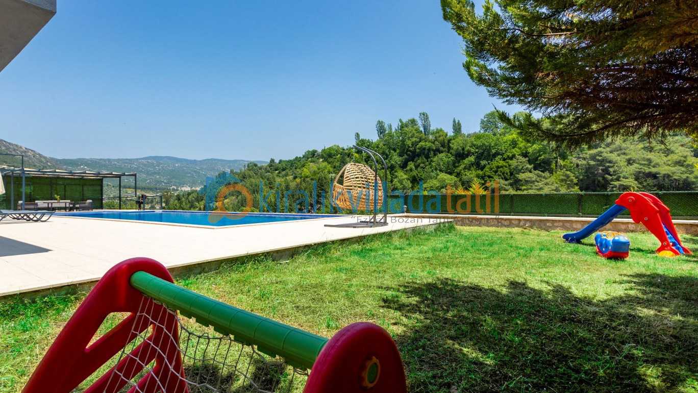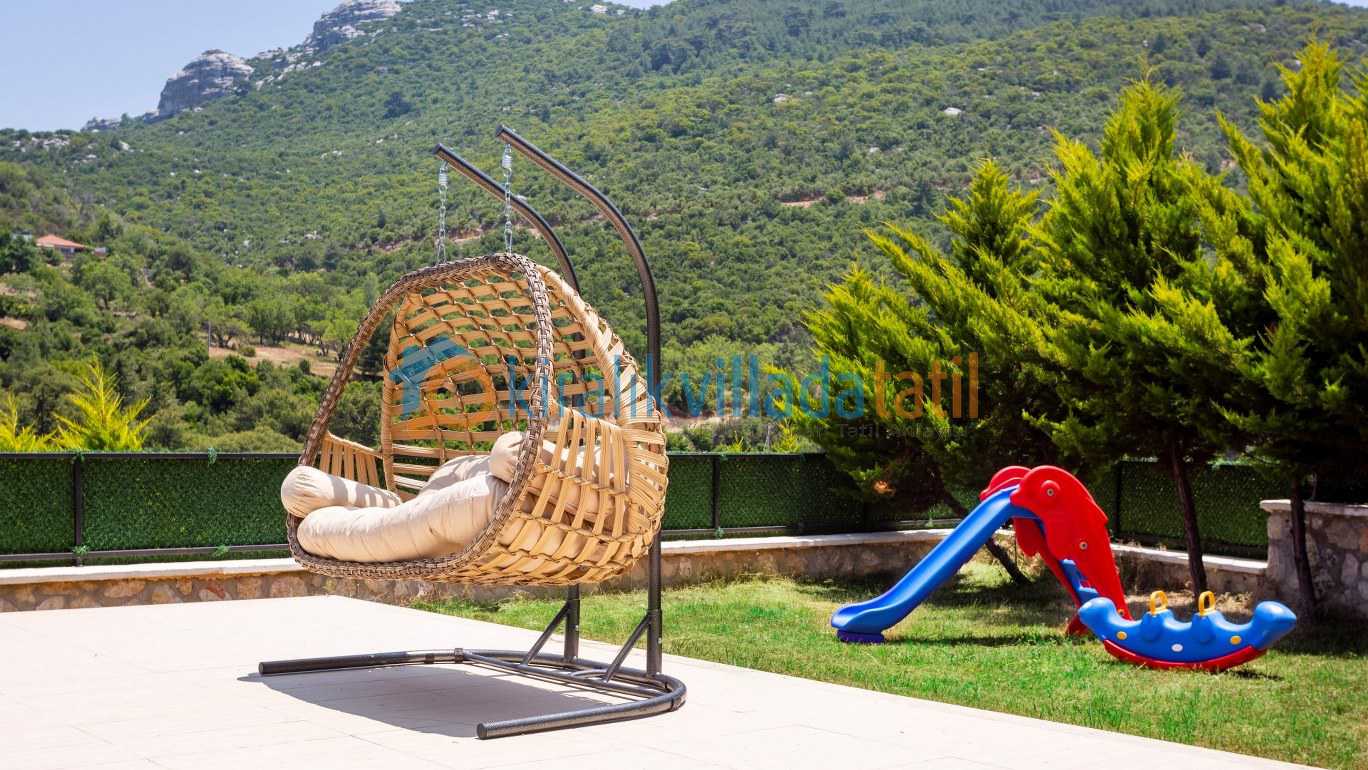 Geniş ve yeşil bahçe alanı özellikle çocuklu aileler için büyük avantaj sağlar. Bahçede yer alan oyun alanları sayesinde küçük misafirler de tatilin tadını özgürce çıkarabilir Aynı zamanda villanın merkeze araçla yaklaşık 10 dakika mesafede bulunması, doğa içinde huzurlu bir konumda konaklarken şehir olanaklarına da kolayca ulaşabilmenizi sağlar