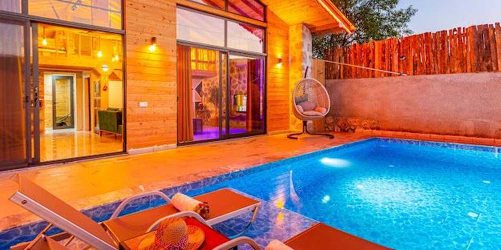 1 yatak odalı ve 2 kişilik kapasiteye sahip olan villamız, modern eşyalarla döşenmiş olup, tamamen korunaklı özel yüzme havuzu sayesinde dışarıdan görünmeden özgürce vakit geçirme olanağı sunar. Bu yönüyle hem balayı çiftleri hem de muhafazakâr aileler için son derece uygundur.
