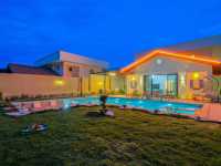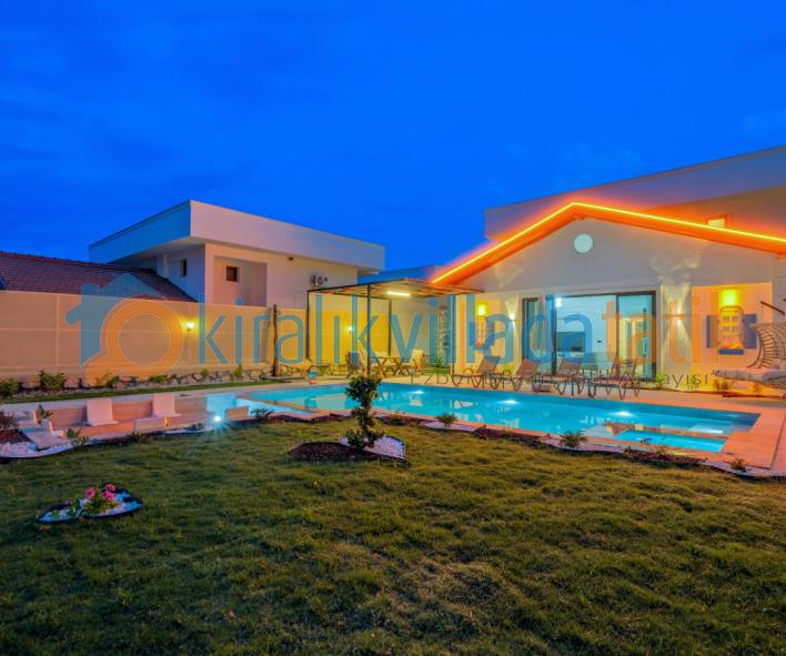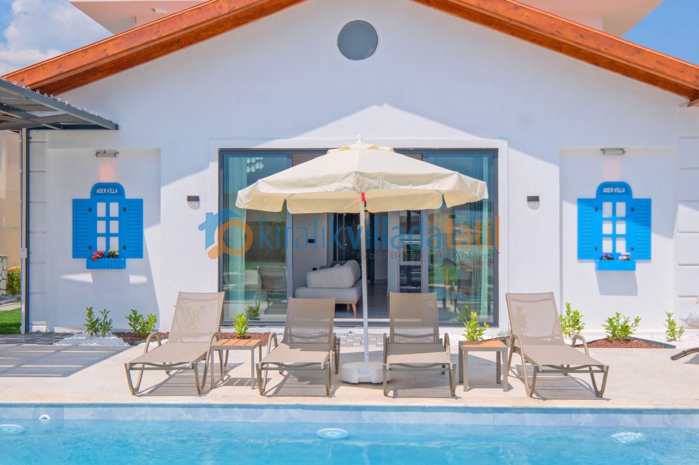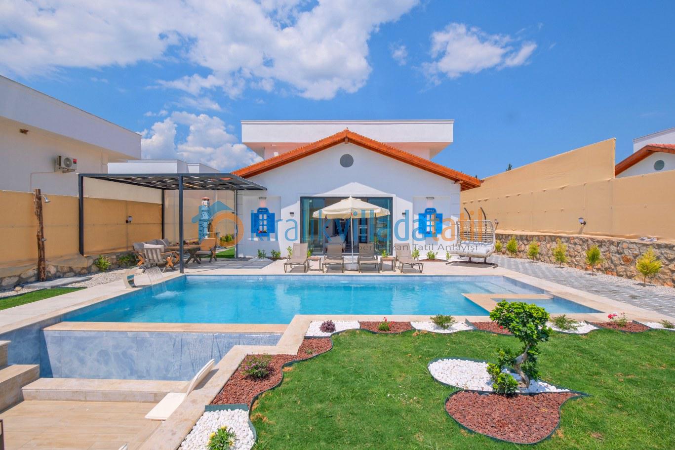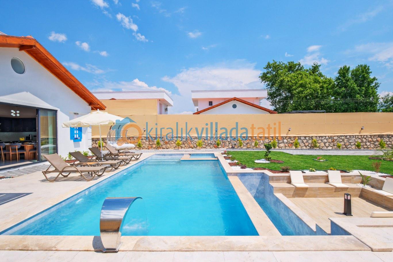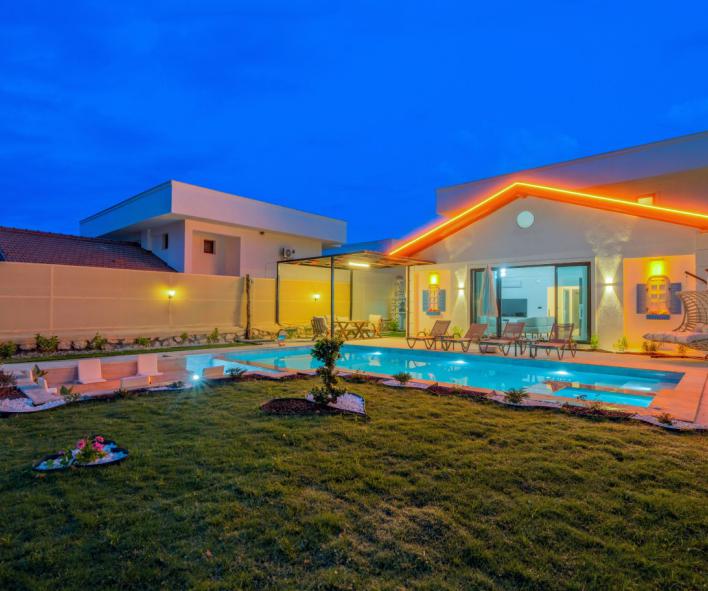Villaya adım attığınız anda sizi karşılayan özel yüzme havuzu ve geniş peyzajlı bahçe, tatil boyunca en çok vakit geçireceğiniz alanlardan biri olacaktır. Güneşlenme terası, konforlu şezlonglar, açık hava oturma grubu ve yemek masası ile hem dinlenebilir hem de sevdiklerinizle keyifli sofralar kurabilirsiniz. Geniş yeşil alanı sayesinde çocuklu aileler için güvenli bir kullanım sunan villa, izole tatil anlayışını ön plana çıkarır.