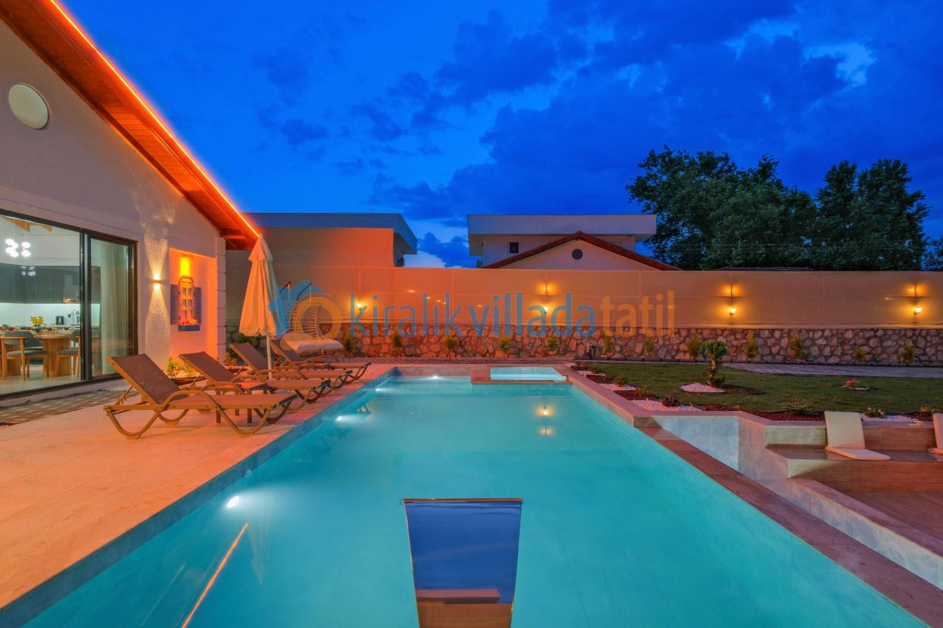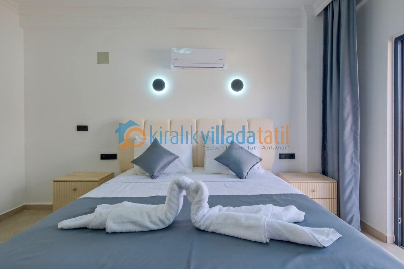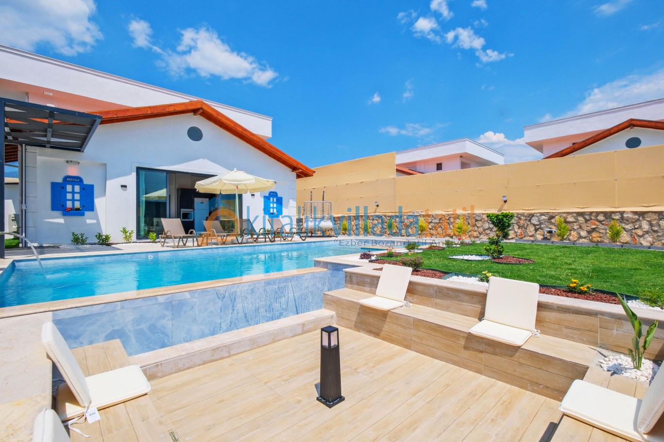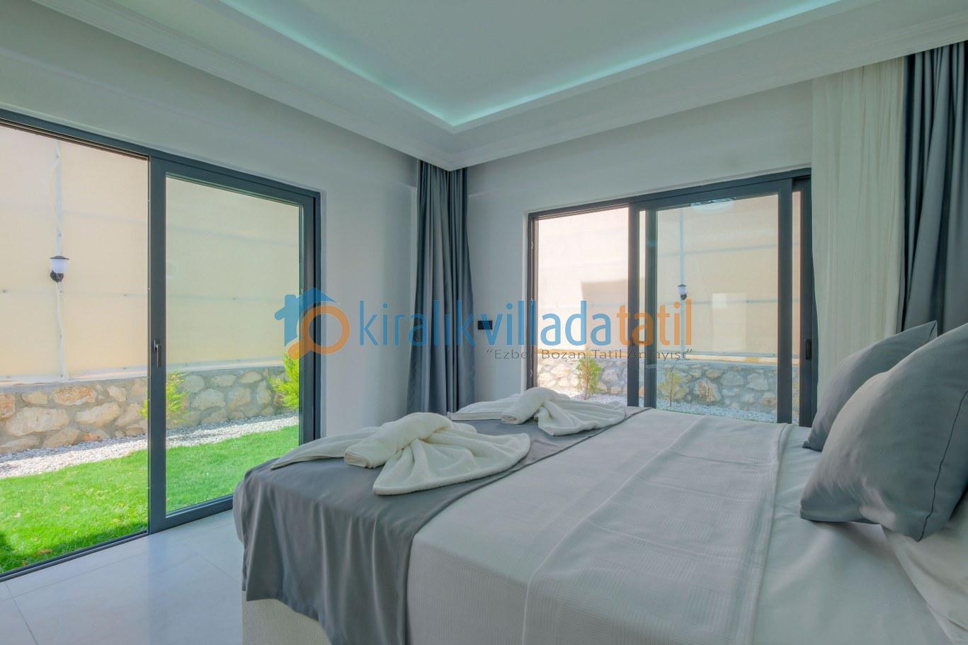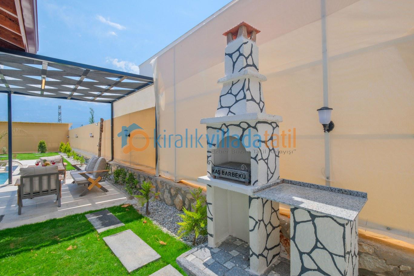 Özel yüzme havuzu ve geniş yeşil bahçe alanı, gün boyu keyifli vakit geçirebileceğiniz konforlu bir dış mekân sunarken; şezlonglar, bahçe oturma grubu ve açık hava yemek alanı tatilinizi klasik konaklama anlayışının ötesine taşır. Çocuklu aileler için güvenli kullanım imkânı sağlayan bahçe yapısı, doğa içinde kiralık villa konseptini en iyi şekilde yansıtmaktadır.