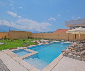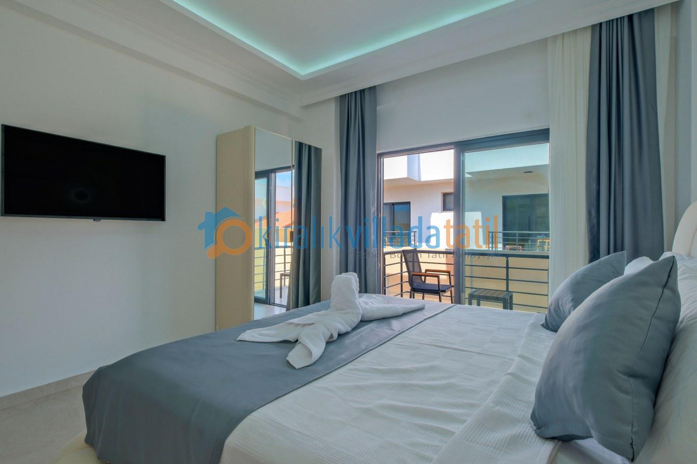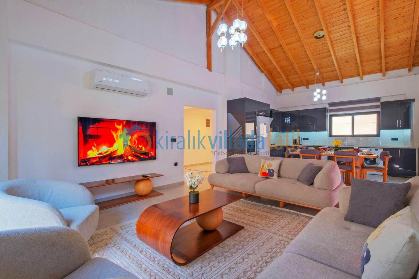 Modern mimari anlayışıyla tasarlanan iç mekânda; ferah salon, tam donanımlı mutfak, konforlu yatak odaları ve her detayın düşünüldüğü kullanım alanları yer almaktadır. Sekiz kişilik konaklama kapasitesine sahip olan bu özel villa, hem kısa süreli tatiller hem de uzun konaklamalar için yüksek konfor standardı sunar. Yeni ve kullanışlı yapısı sayesinde misafirlerine ev sıcaklığında bir tatil imkânı sağlar.