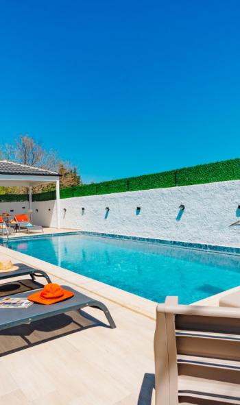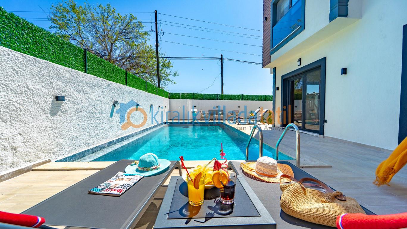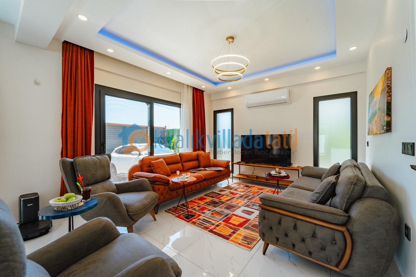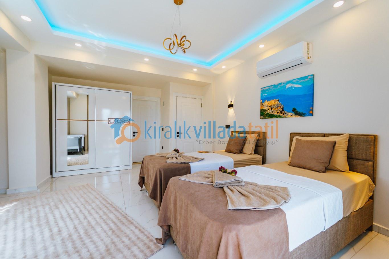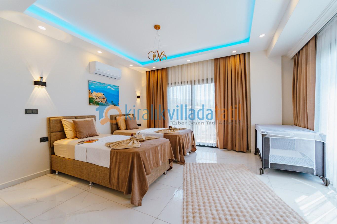 Toplam 4 yatak odası bulunan villa, 8 kişiye kadar konaklama kapasitesiyle kalabalık aileler ve arkadaş grupları için ideal bir kullanım sunar. İç mekânlarda modern dekorasyon anlayışı benimsenmiş; ferah yaşam alanları, işlevsel mobilyalar ve konfor odaklı detaylarla tatil süreci maksimum rahatlıkla planlanmıştır.